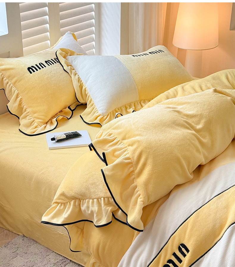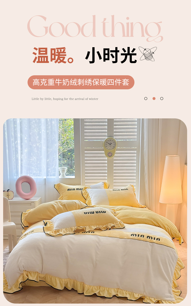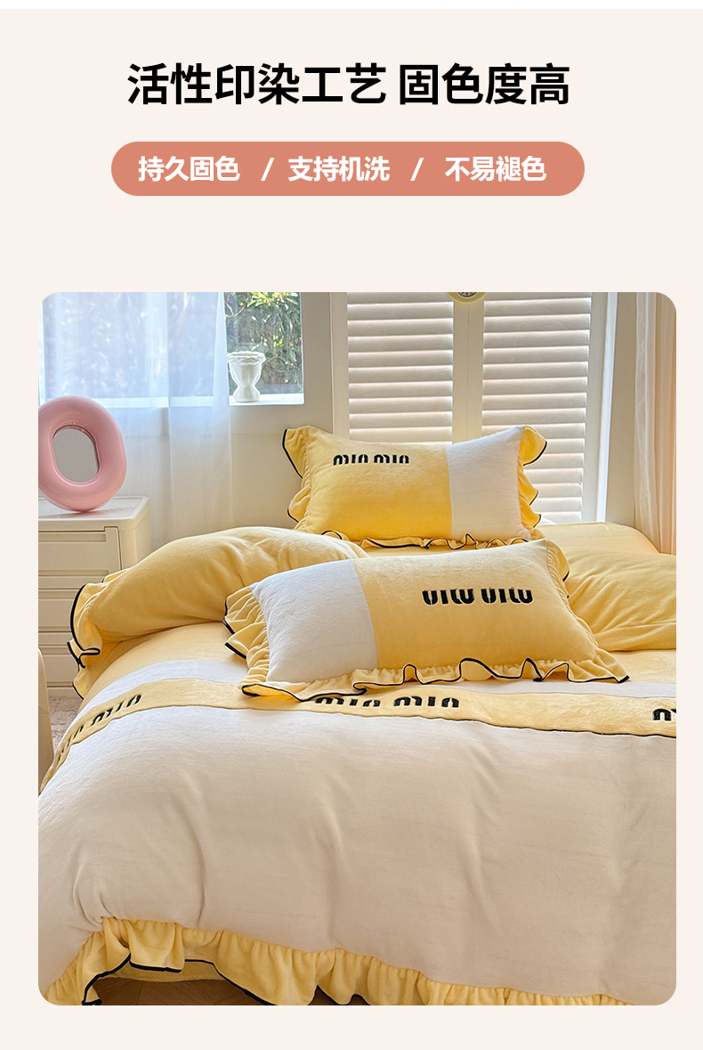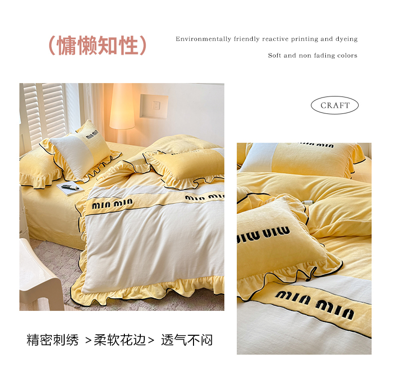 凯美家居 2024新款牛奶绒刺绣花边四件套-美丽格 美丽格-亮黄