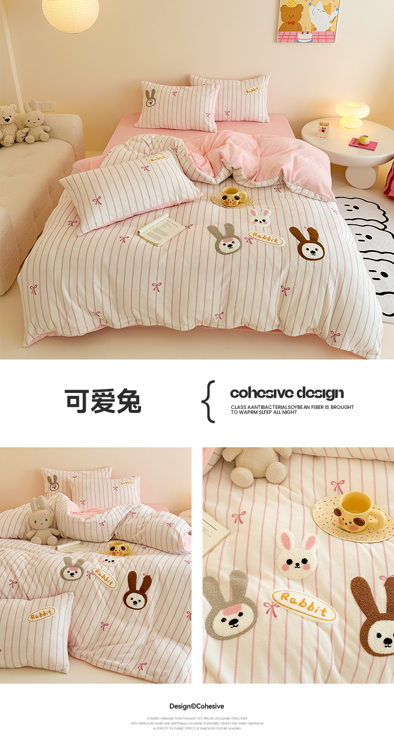 沐棉家居 2024新款高克重条纹牛奶绒毛巾绣四件套 可爱兔