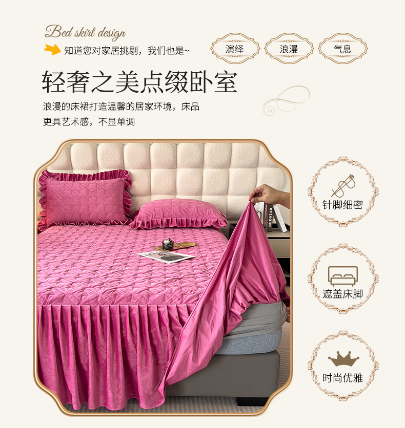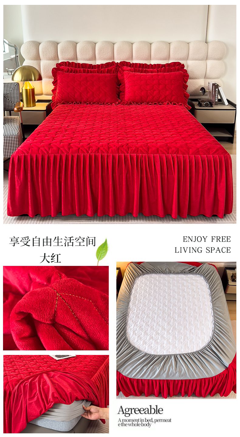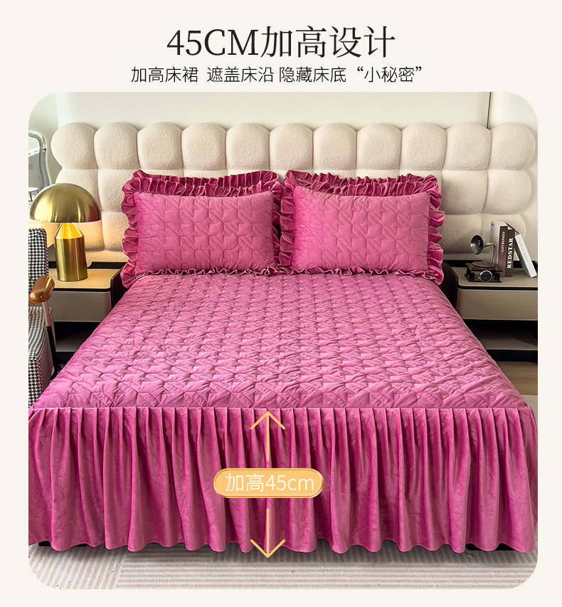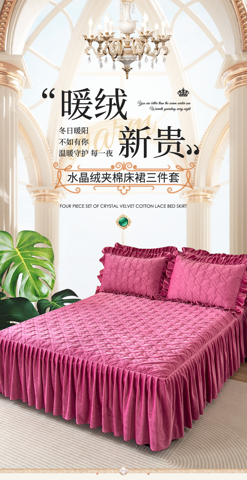 (总)屹成家纺2025新款水晶绒夹棉绗缝蕾丝床裙三件套(塞纳河畔)床裙单件起售价不低于105元,大红,豆沙,翡翠绿,粉玉,橄榄绿,蔚蓝,银灰