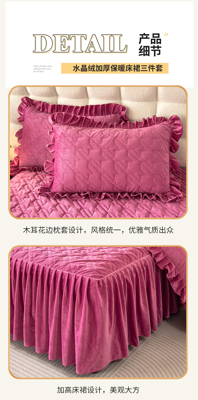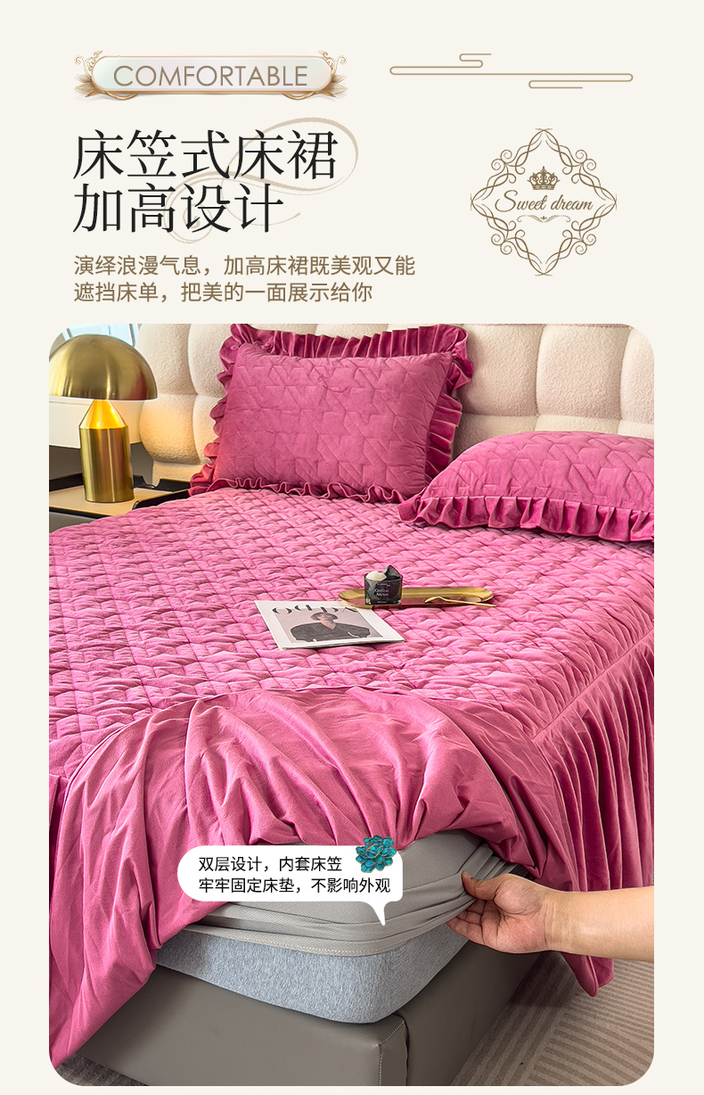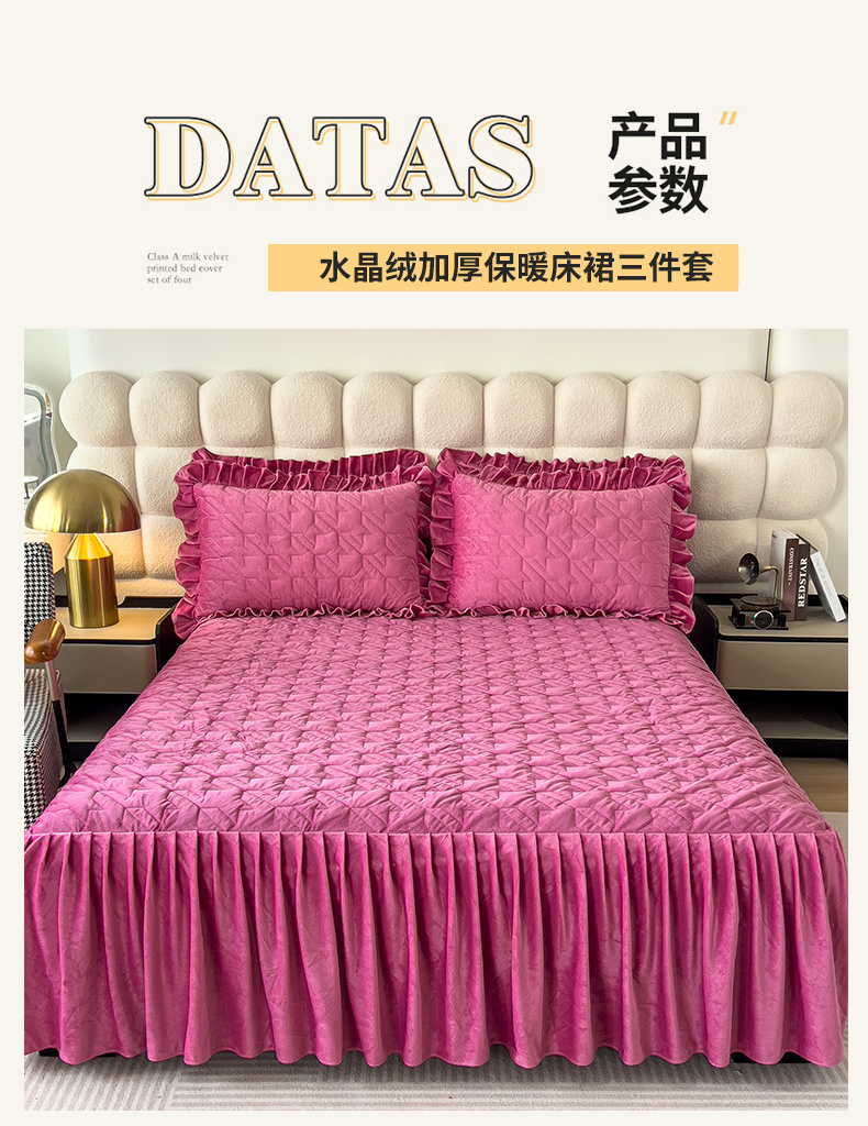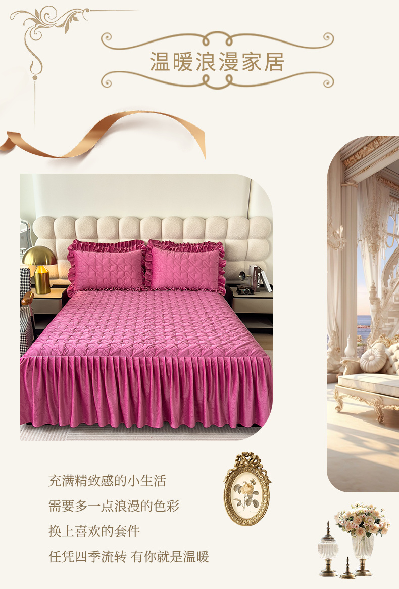 (总)屹成家纺2025新款水晶绒夹棉绗缝蕾丝床裙三件套(塞纳河畔)床裙单件起售价不低于105元,大红,豆沙,翡翠绿,粉玉,橄榄绿,蔚蓝,银灰
