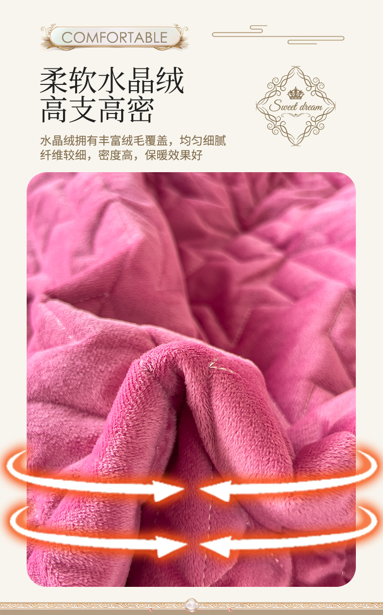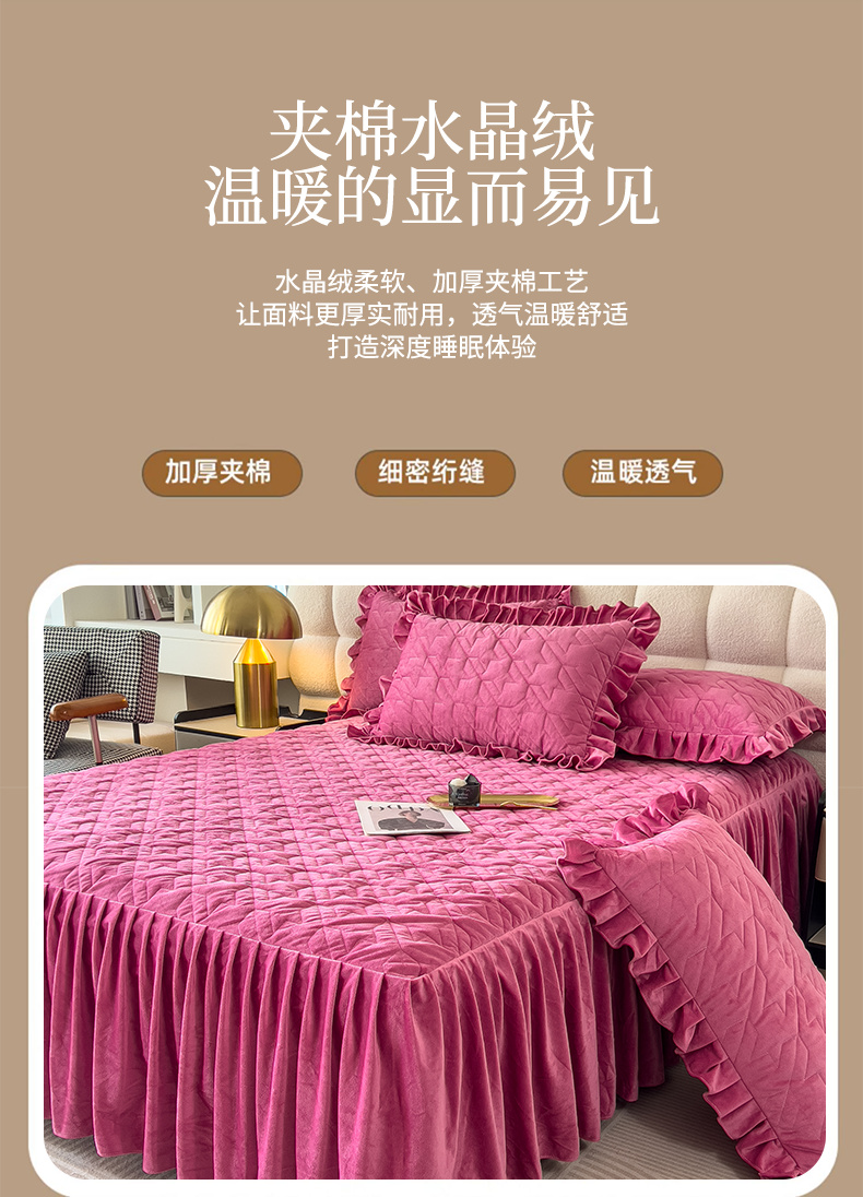 (总)屹成家纺2025新款水晶绒夹棉绗缝床裙四件套(塞纳河畔)四件套起售价不低于230元,大红,豆沙,翡翠绿,粉玉,橄榄绿,蔚蓝,银灰