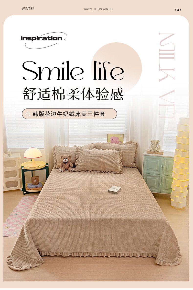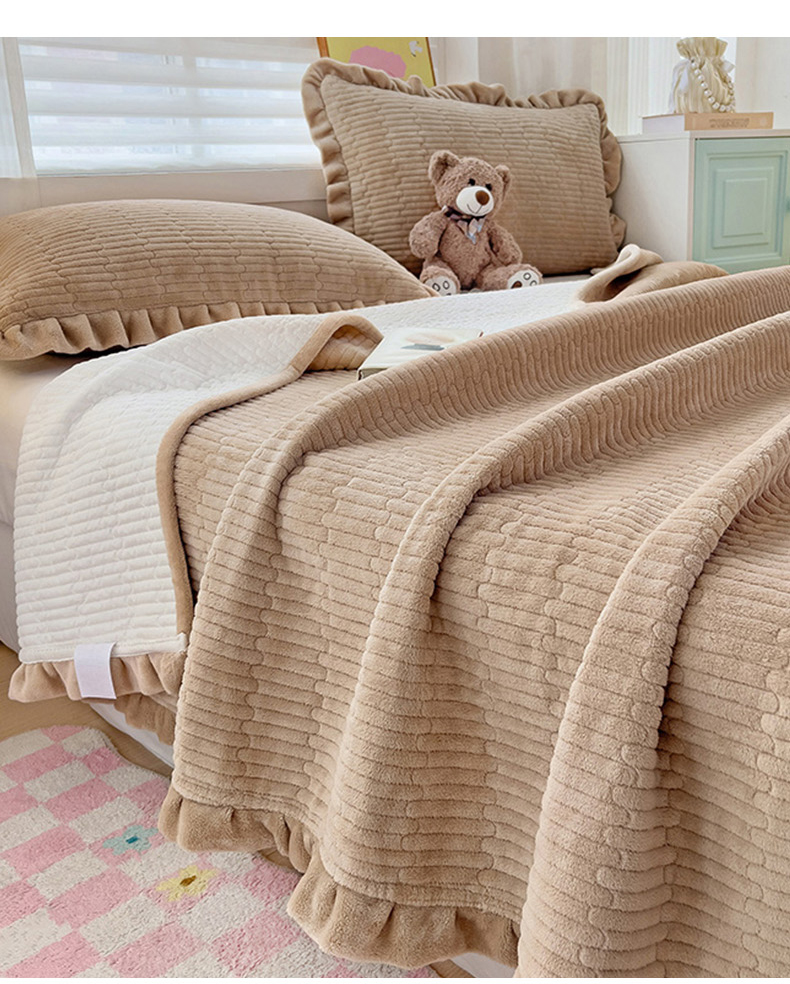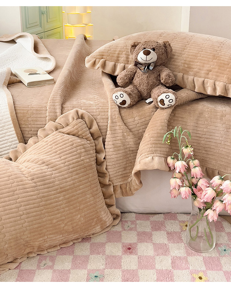 富瑞阁 2024新款牛奶绒宝宝绒韩版花边床盖三件套单品 浅驼