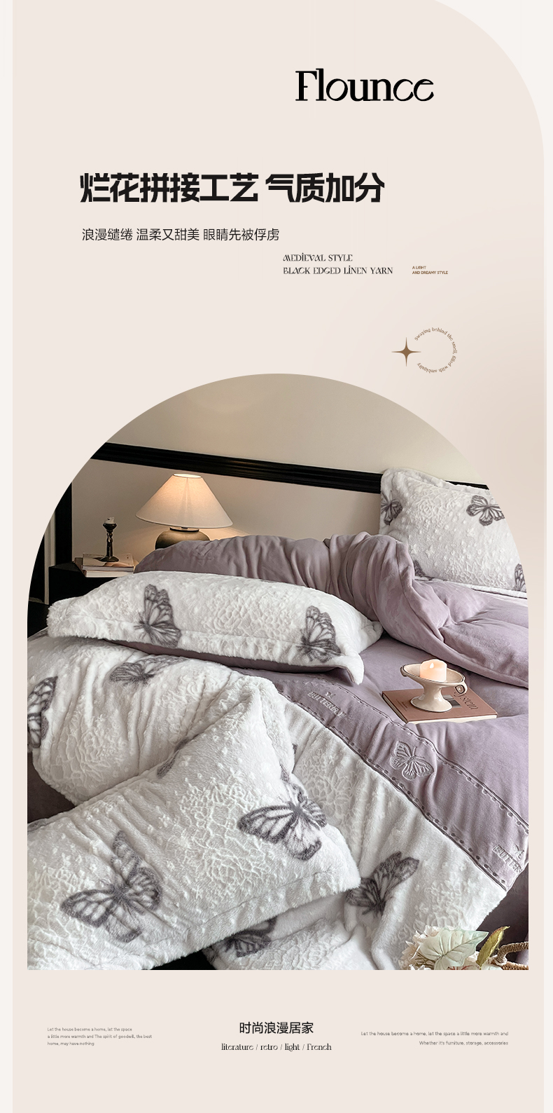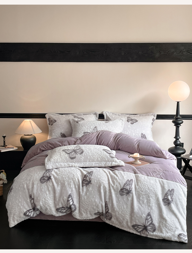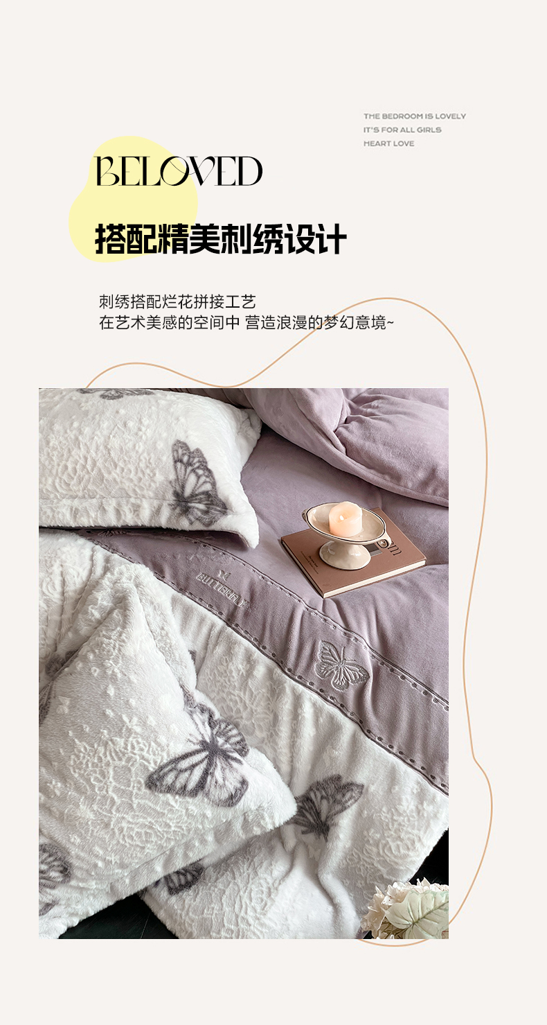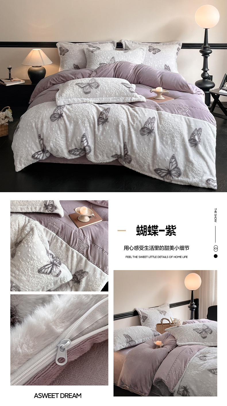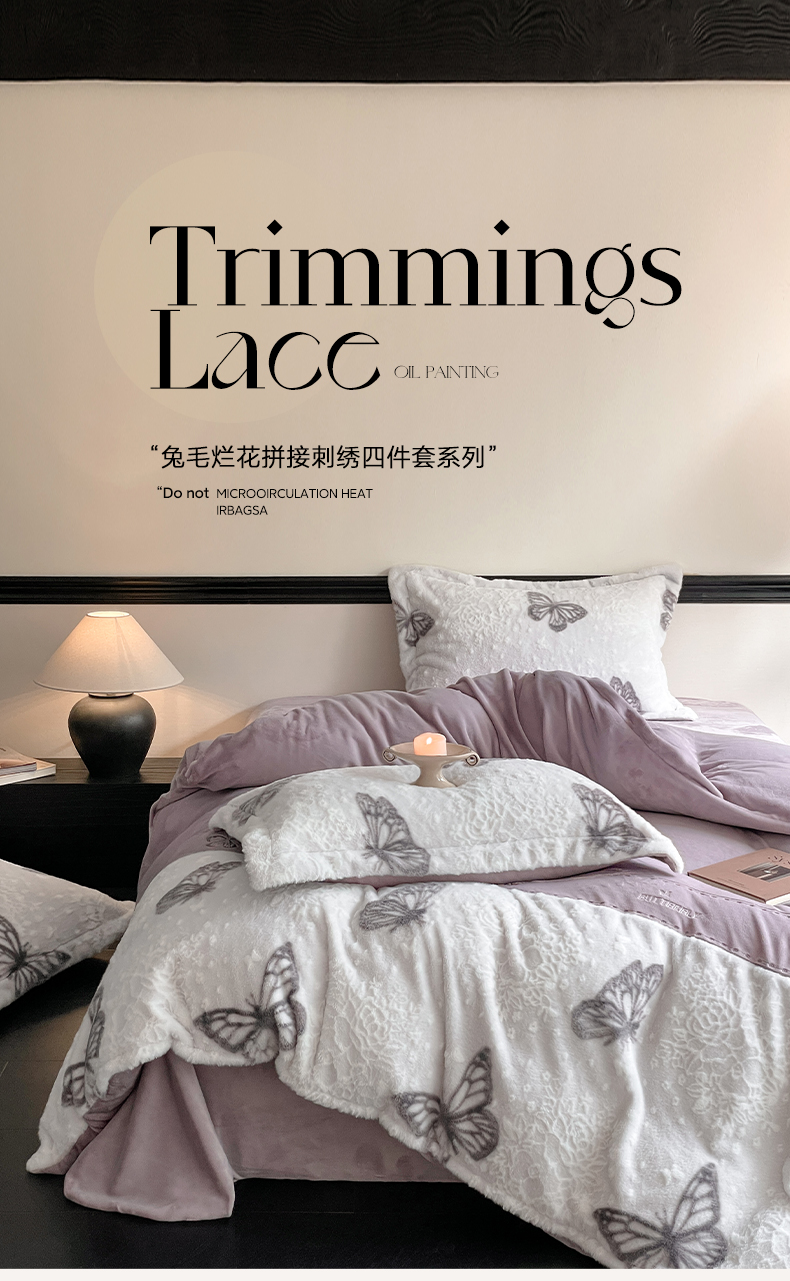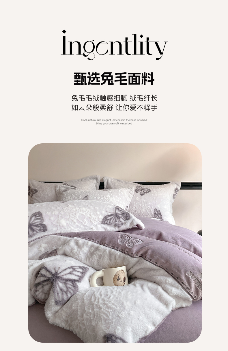 卡巴伦家纺 2024新款兔毛烂花拼接刺绣四件套 蝴蝶-紫