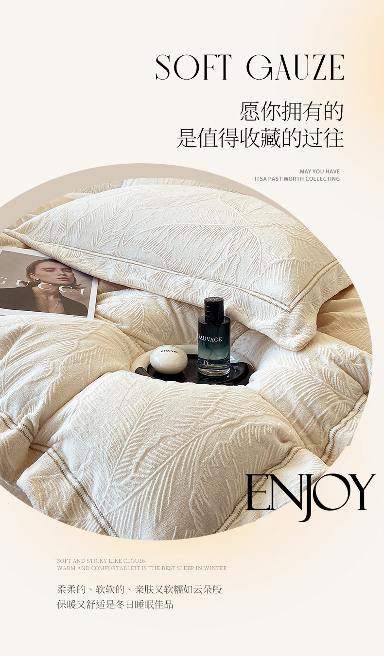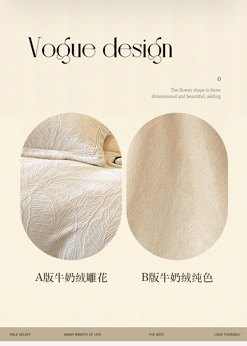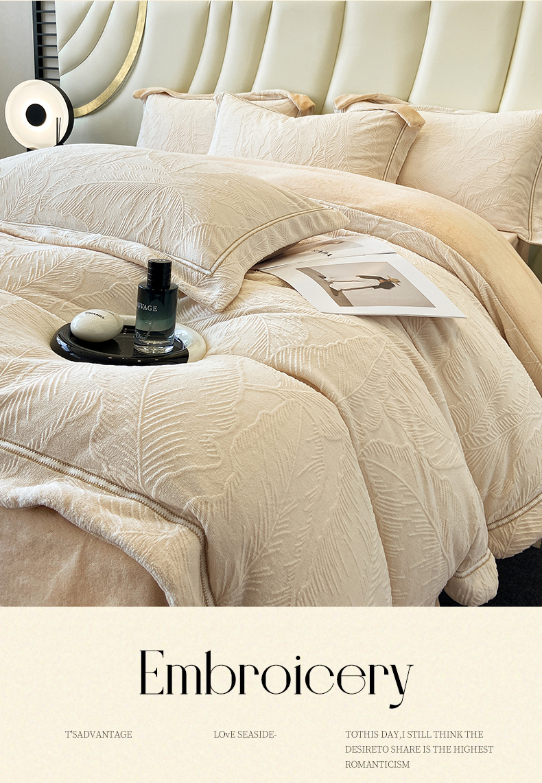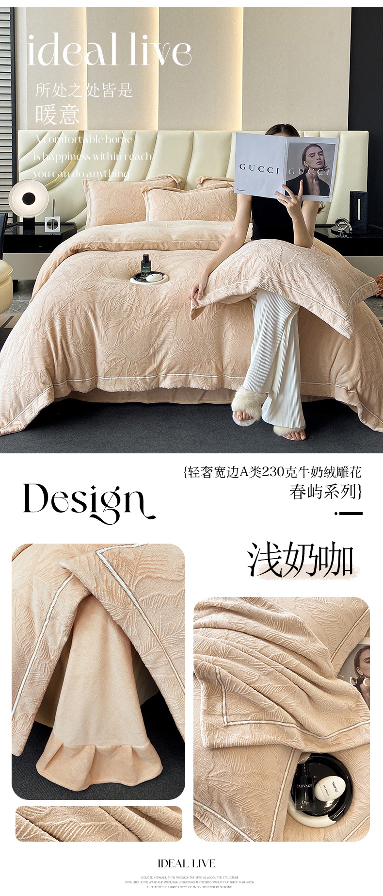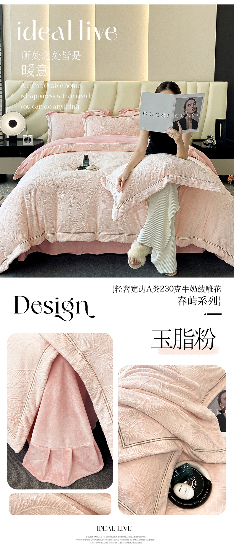 金喜 2024新款AB230克全消光牛奶绒雕花绒四件套--春屿系列 玉脂粉