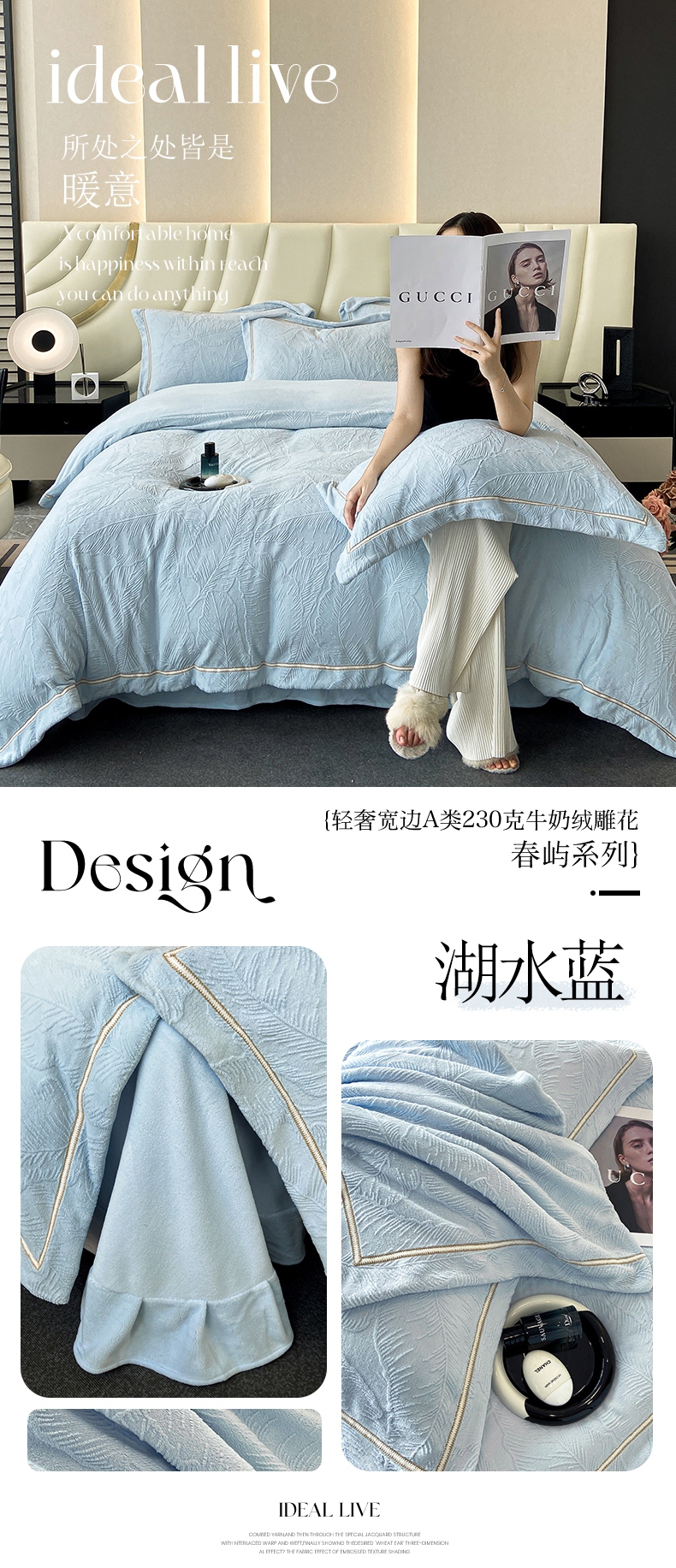 (总)金喜 2024新款高克重全消光牛奶绒雕花绒床盖四件套加厚牛奶绒床盖套件--极简主义床盖套件系列,皮粉,石灰,蔚蓝,杏仁