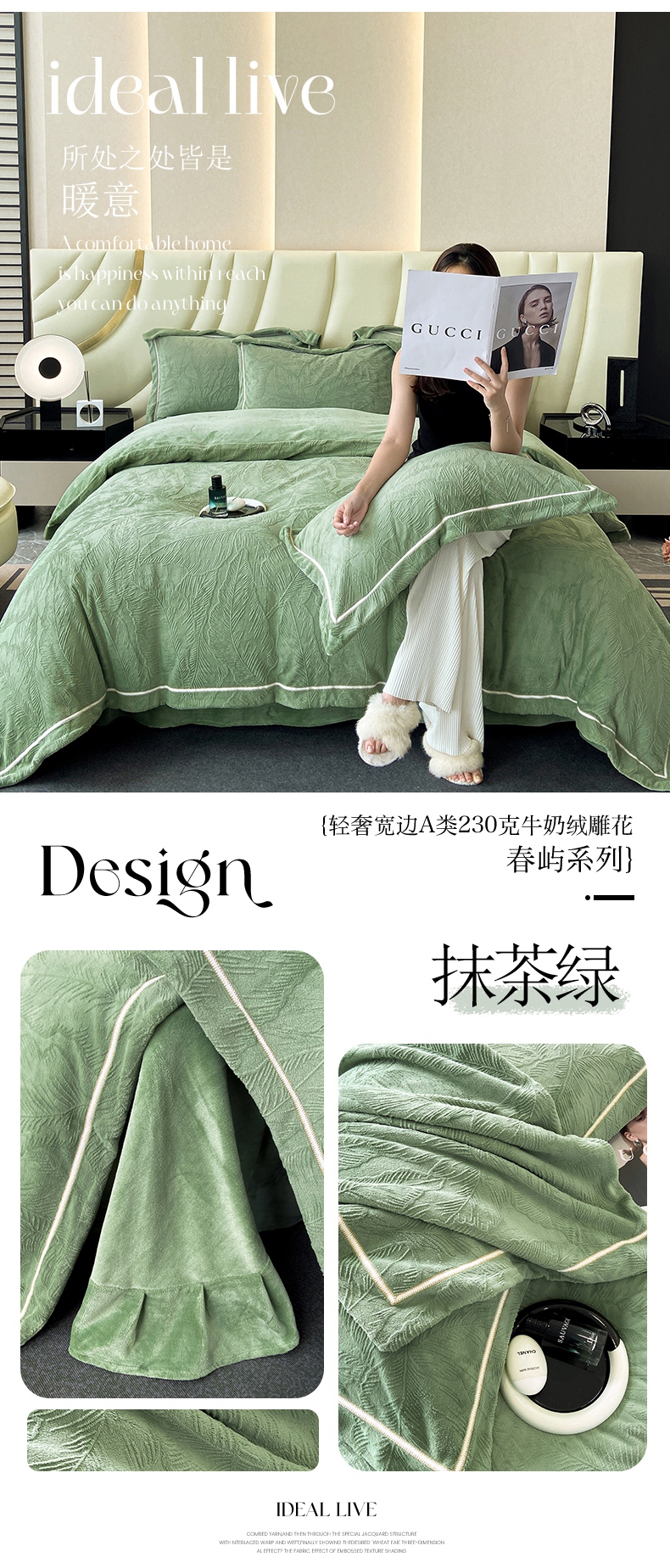 (总)金喜 2024新款230克高克重牛奶绒雕花四件套优雅风牛奶绒套件-木槿系列,木槿-粉,木槿-绿