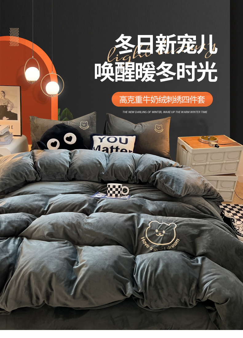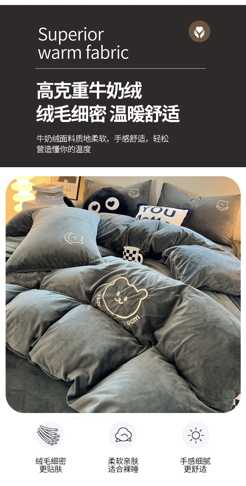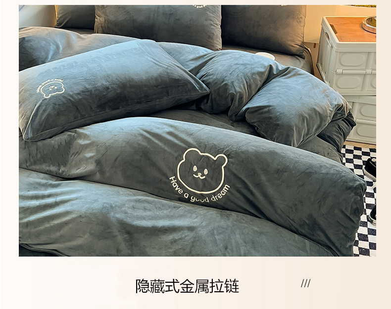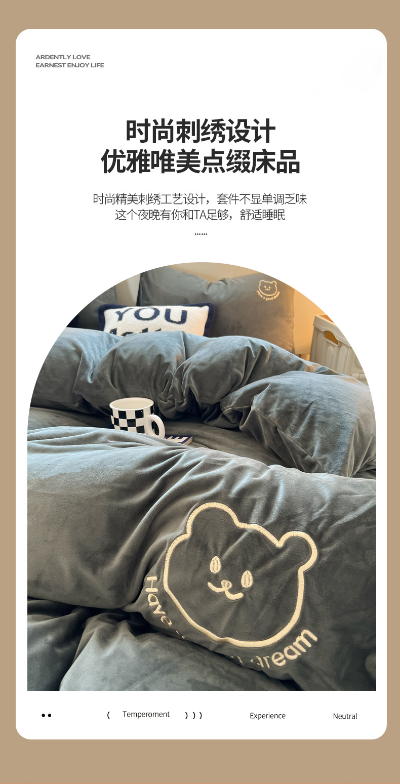 当前位置: 91家纺网 > 商品网购 > 床品套件 > 四件套 > 牛奶绒四件套 > yyds网供 【场景一】短绒小熊刺绣水晶绒四件套轻奢秋冬牛奶绒简约-小熊系列 小熊-深灰
