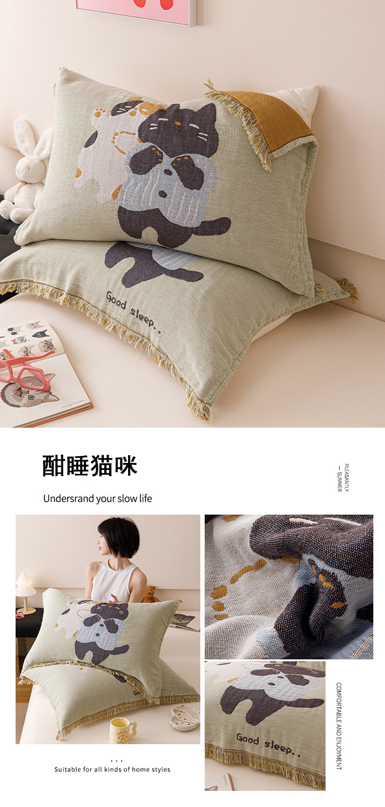 • 91家纺网 家纺一手货源 找家纺 麻依 2024新款全棉流苏款四层纱布枕巾52*75cm 酣睡猫咪