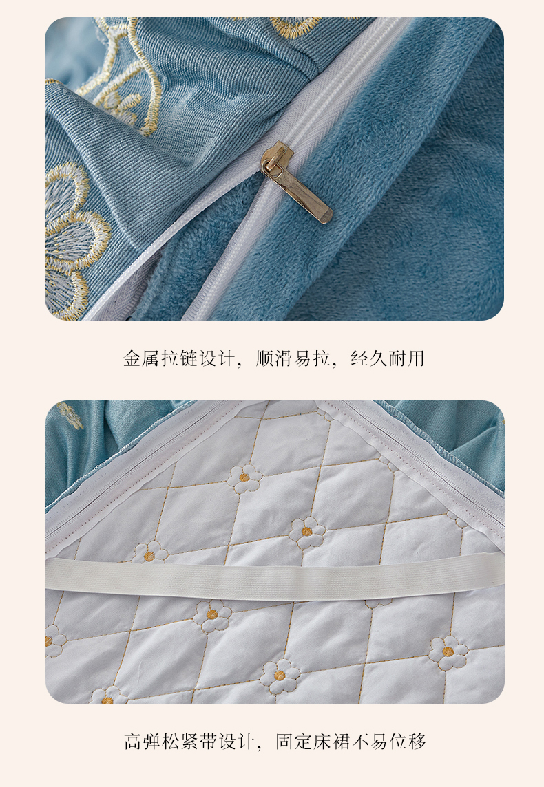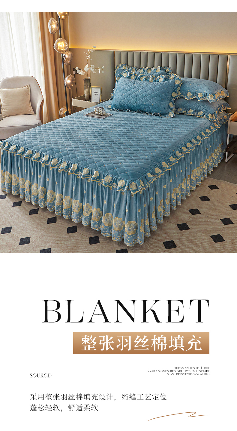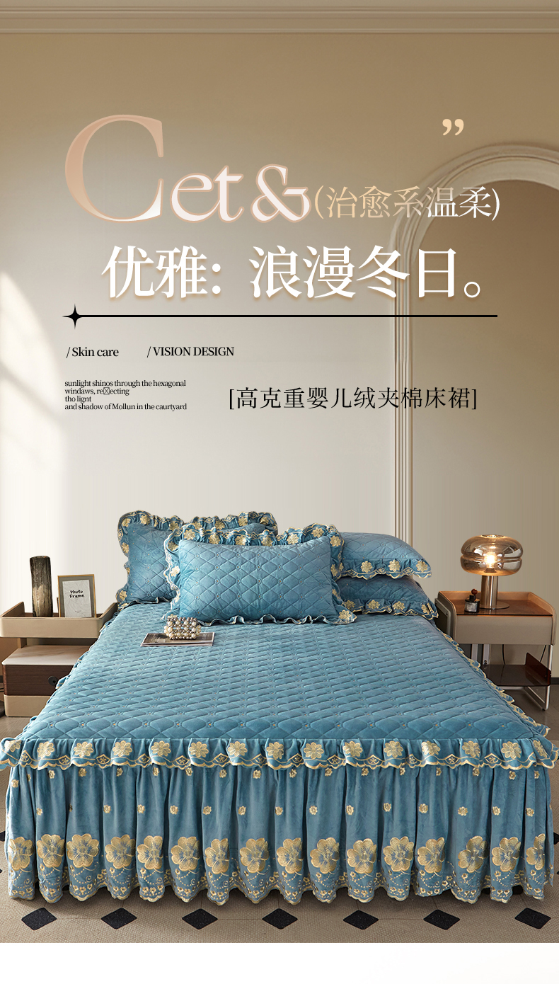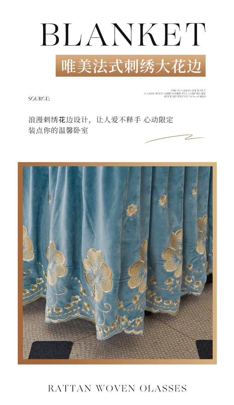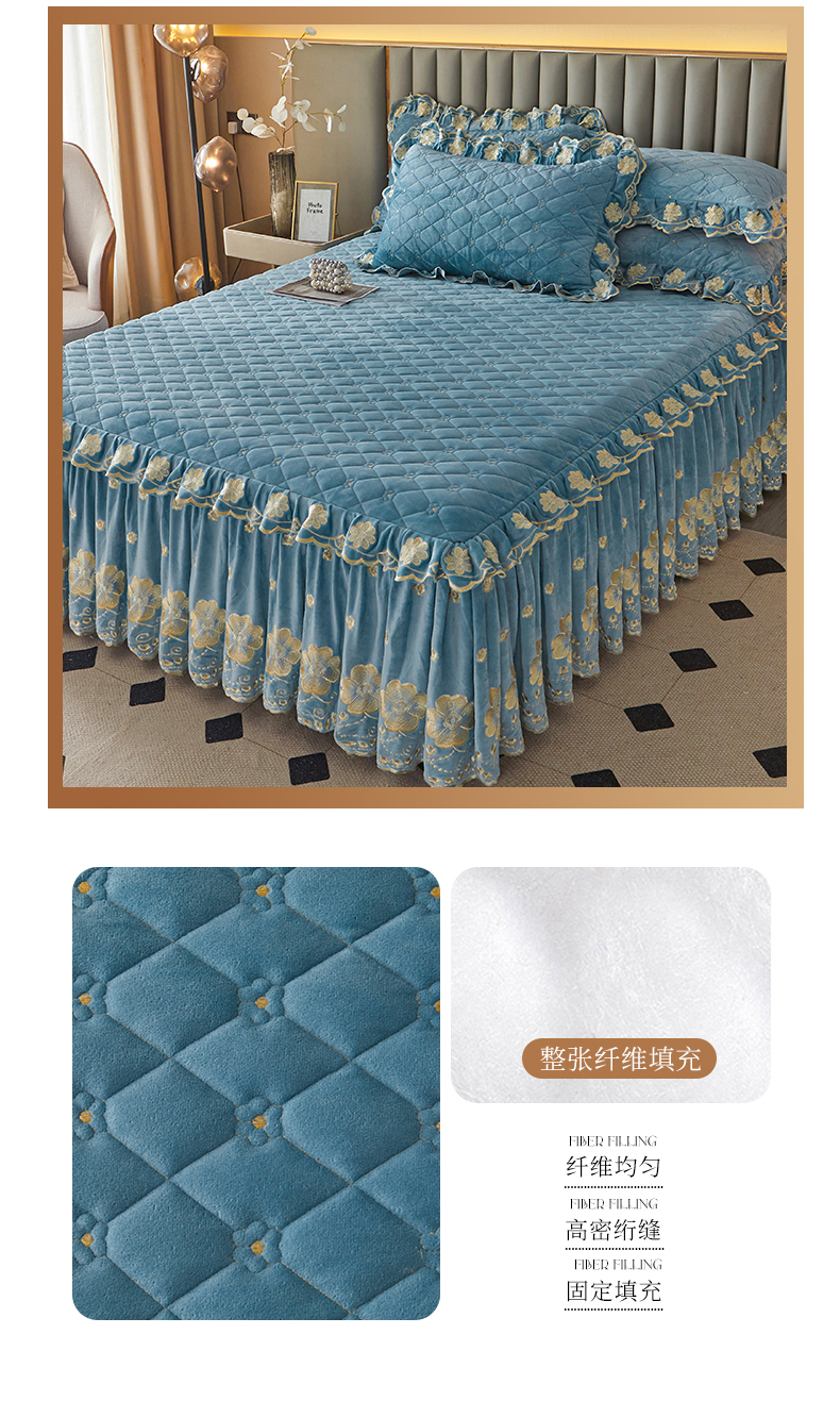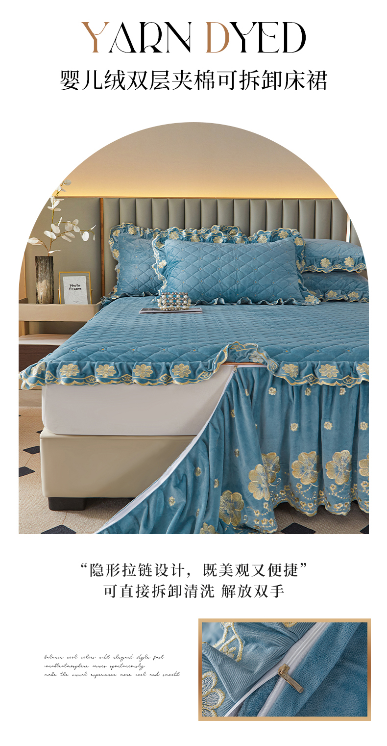 • 91家纺网 家纺一手货源 找家纺 罗艺轩 2025新款婴儿绒双层夹棉可拆卸床裙-花语 花语-湖蓝