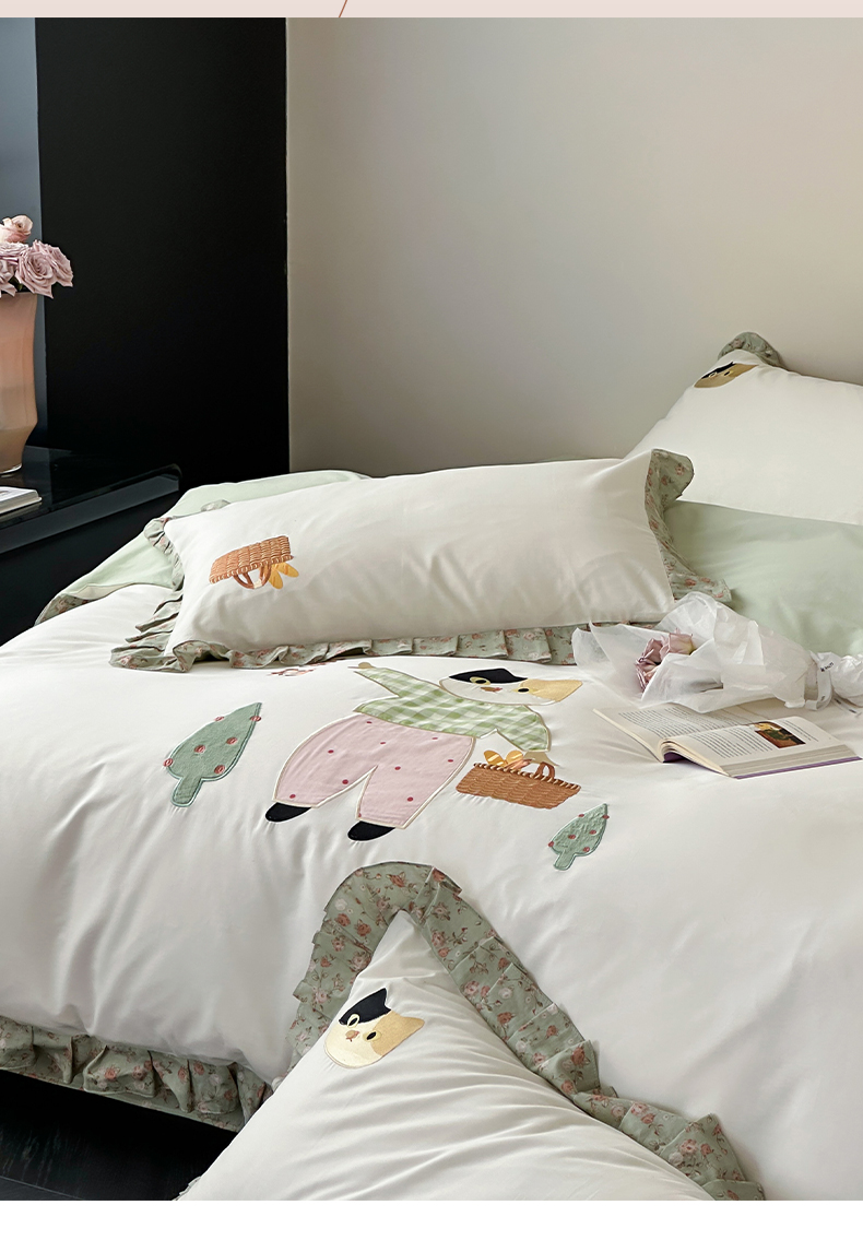 (总)卡巴伦家纺 2025新款全棉皱皱纱大版卡通数码印花款四件套一,洛可可兔-粉,班尼的花园-粉,班尼的花园-黄,漂亮的领结-绿,漂亮的领结-米白,熊猫噗噗-绿,樱桃真甜-奶白