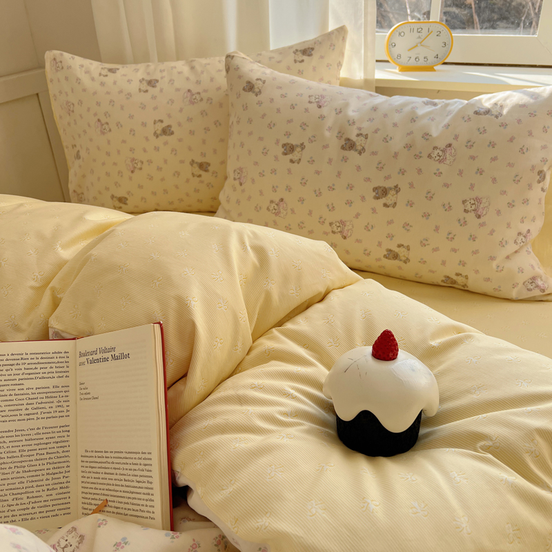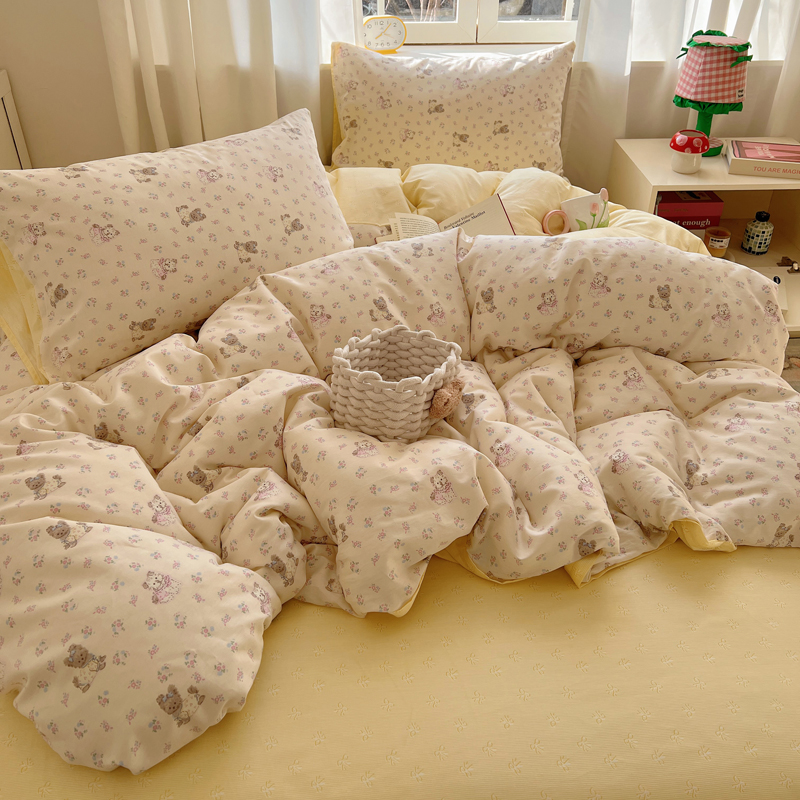 (总)桃喜 2025新款亲肤卡通系列四件套,黄格小熊,拼接甜心猫