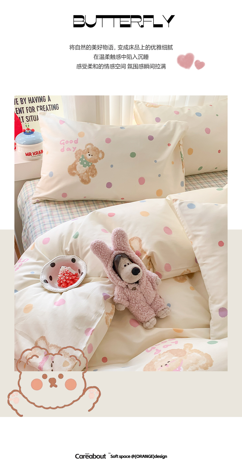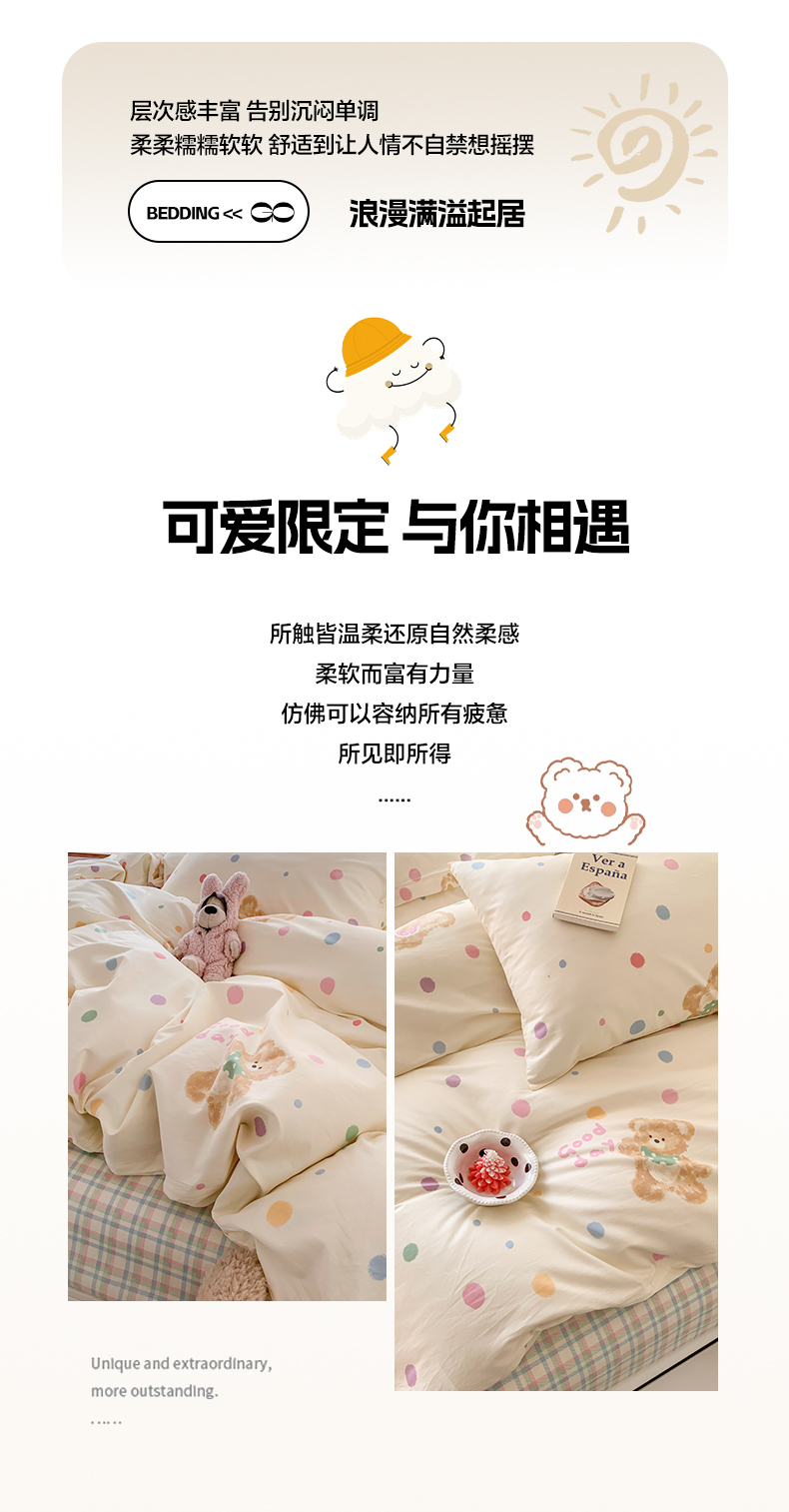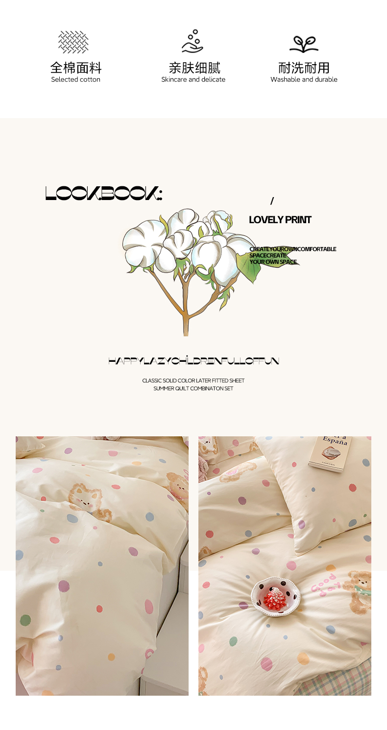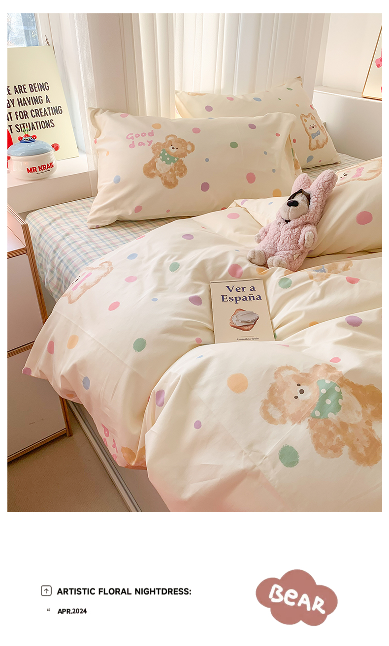 商品名称:澳萝拉 2025新款小碎花清新春夏全棉花边双层纱韩系三件套四件套 奶油小熊