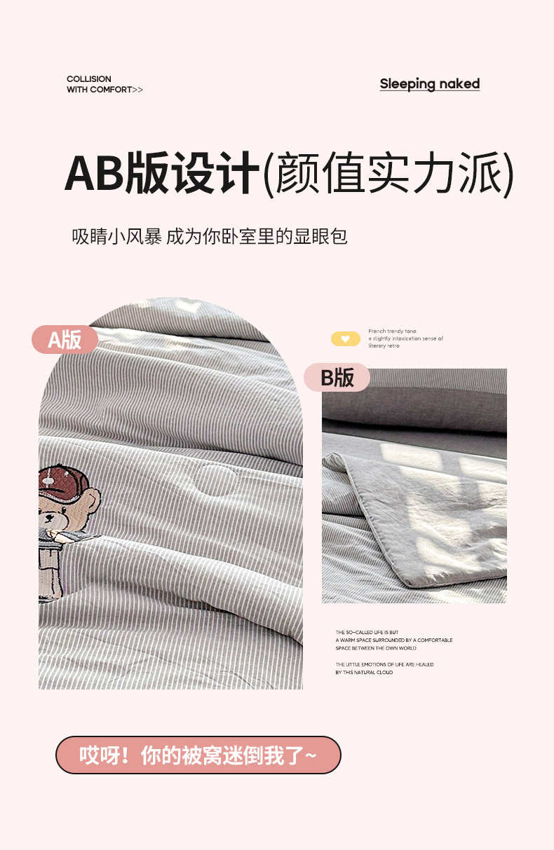 其奥家纺 2025新款专版纯棉色织水洗棉刺绣全棉夏被四件套夏凉被 篮球小熊-细条灰