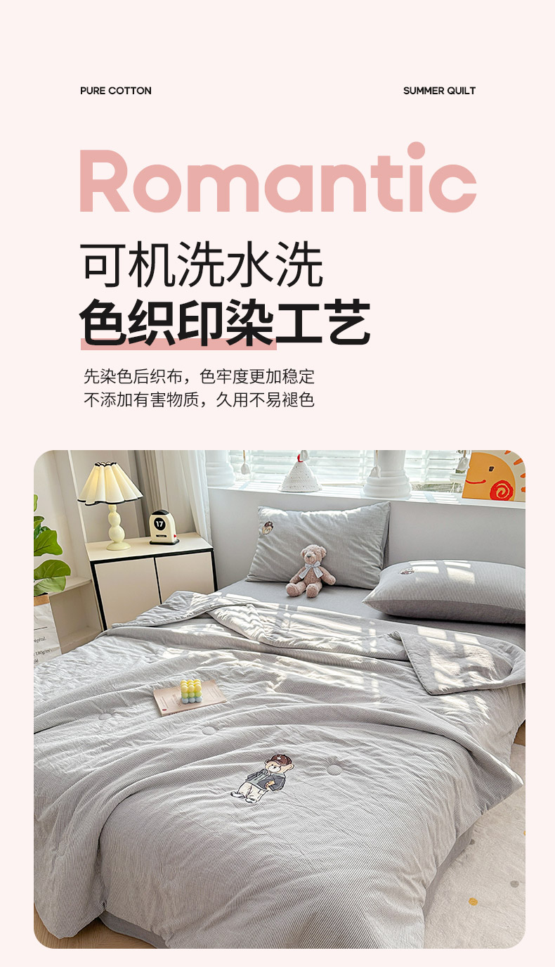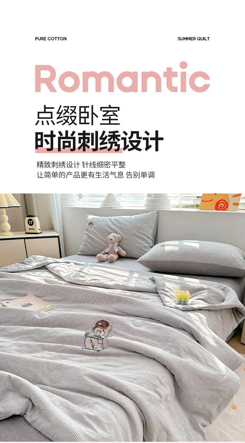 商品名称:其奥家纺 2025新款专版纯棉色织水洗棉刺绣全棉夏被四件套夏凉被 篮球小熊-细条灰