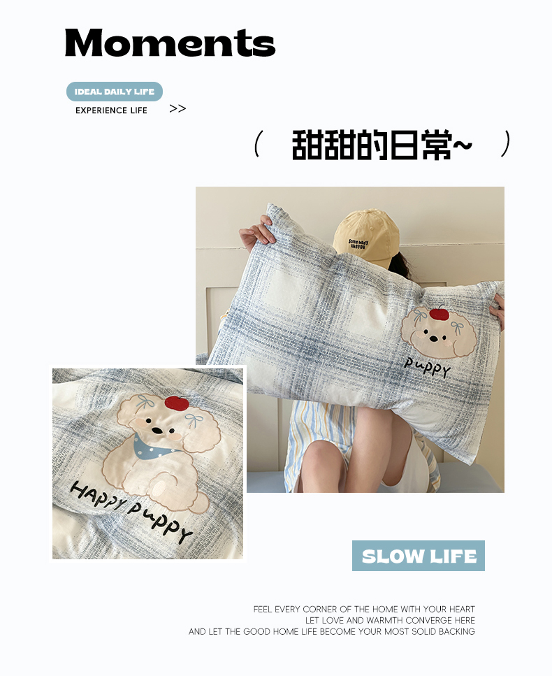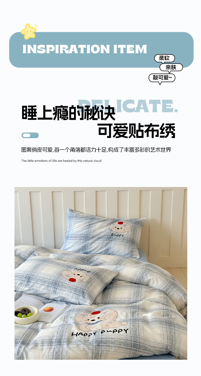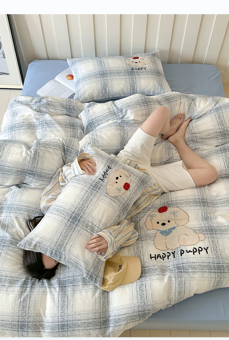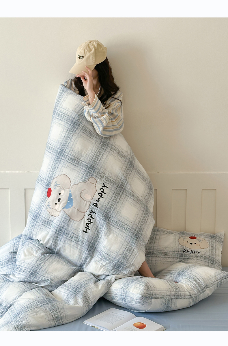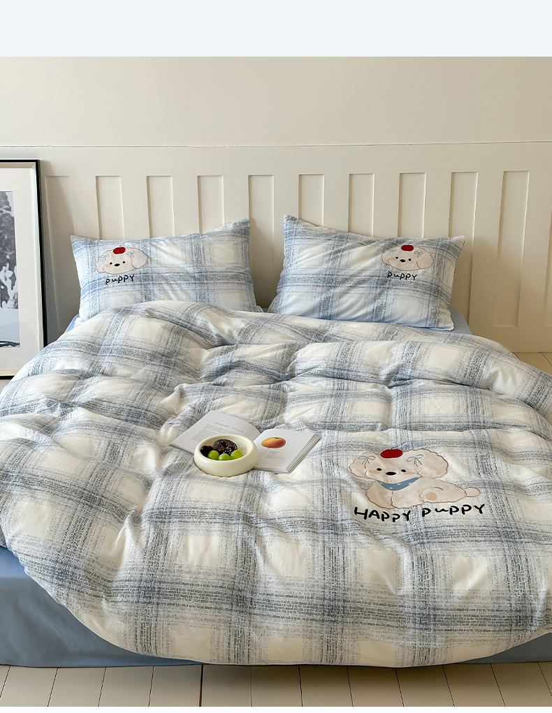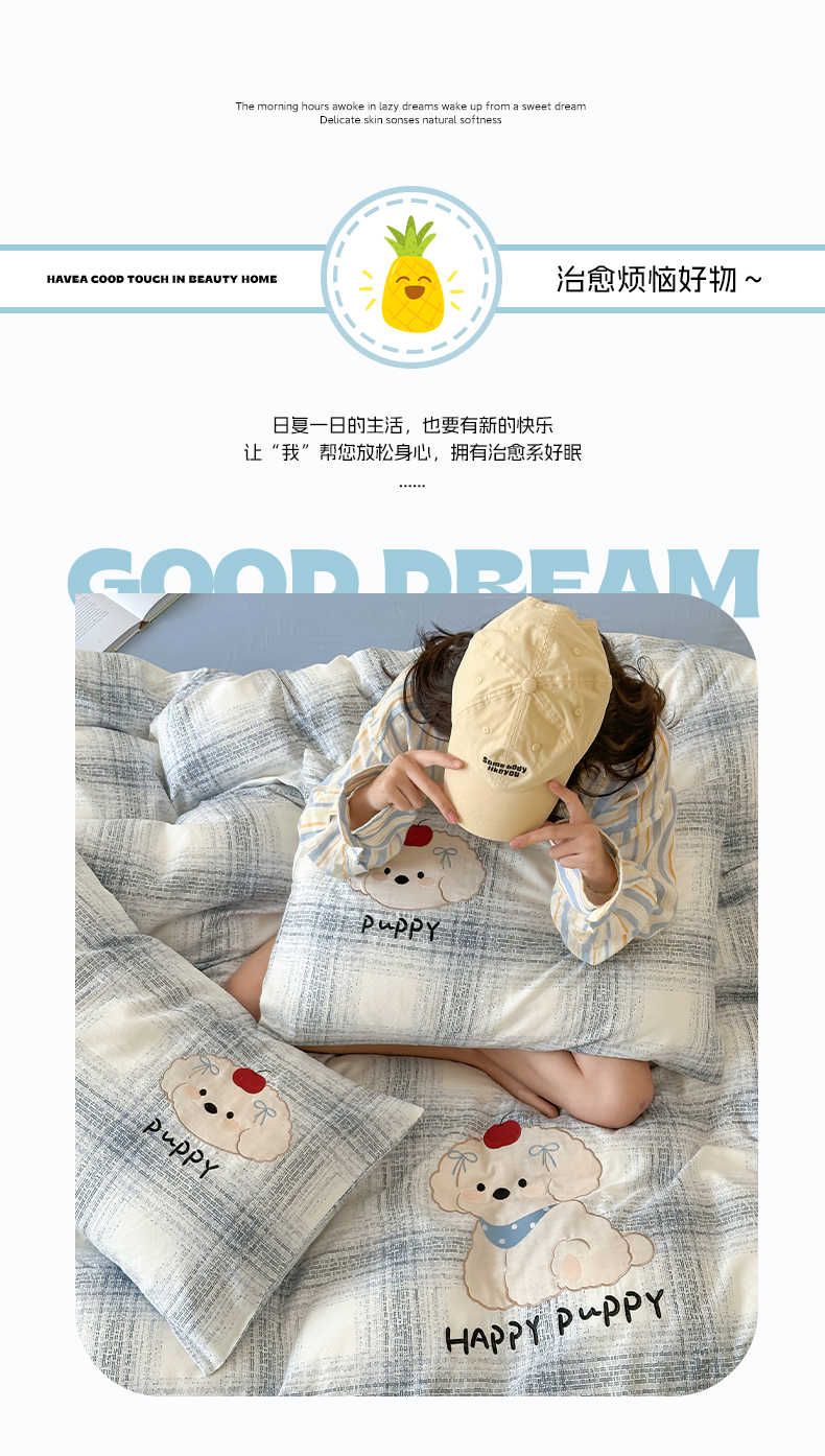 商品名称:圆岛家纺 2025新款全棉双层纱贴布绣四件套 小狗莎莎