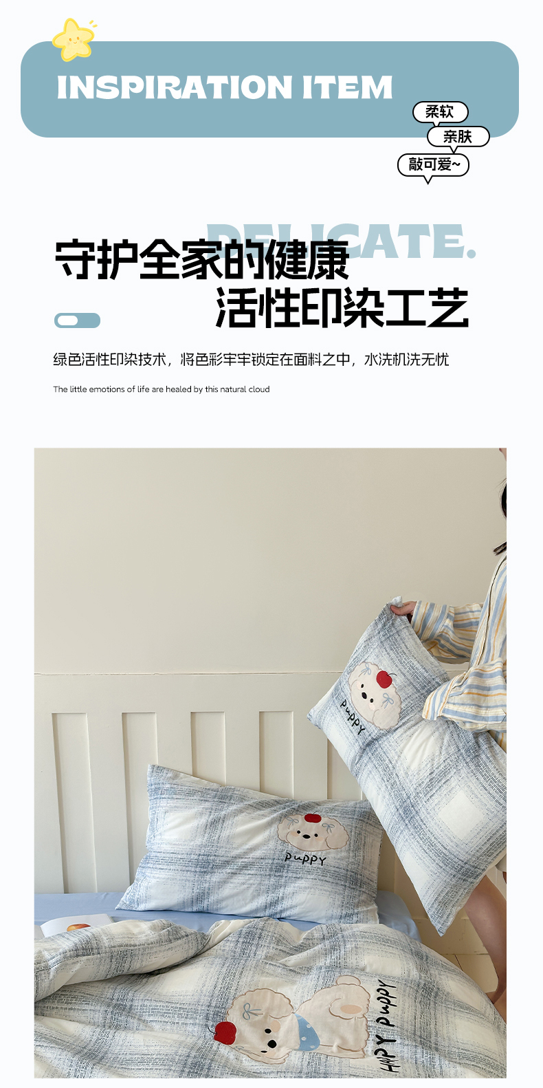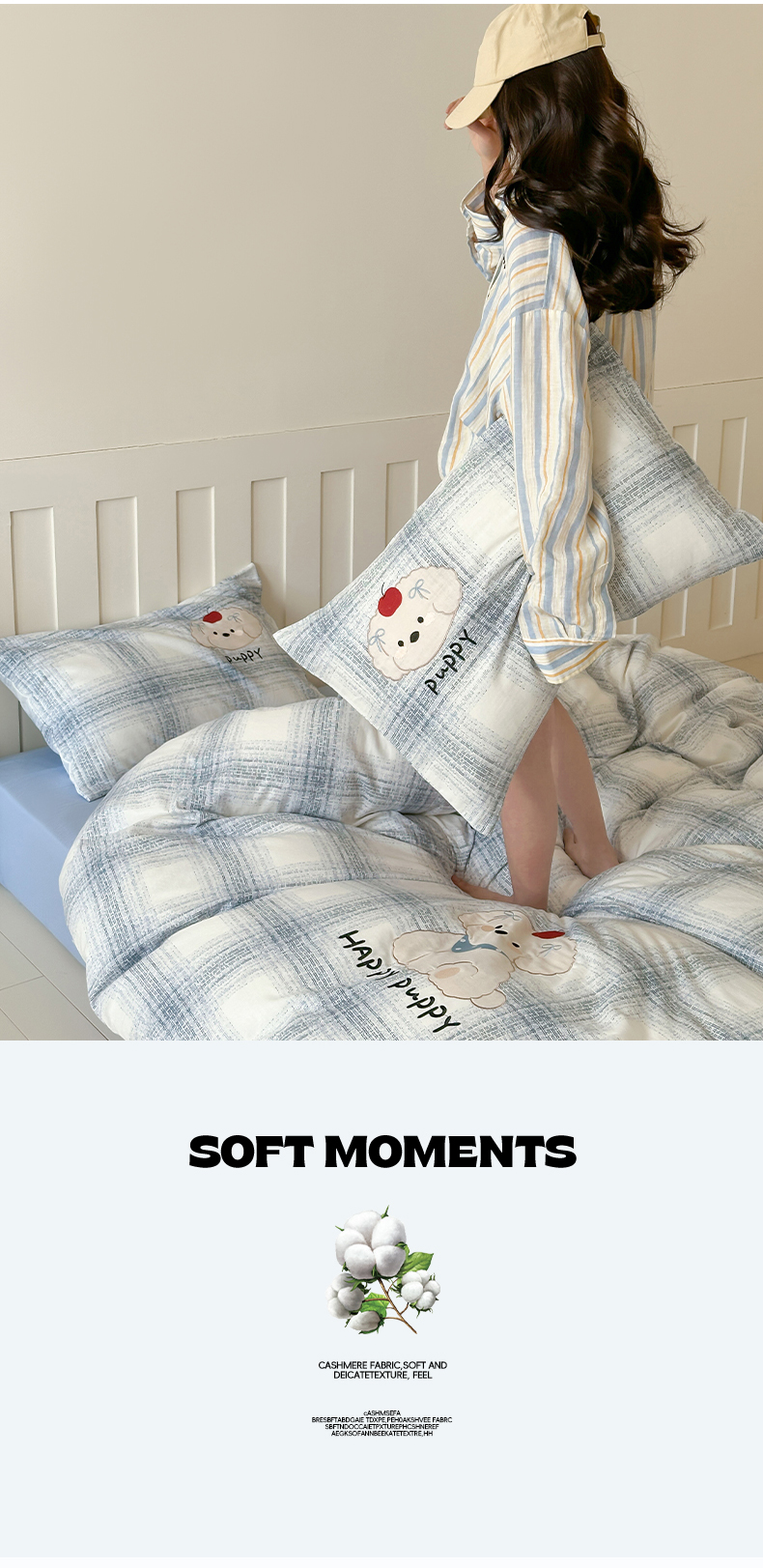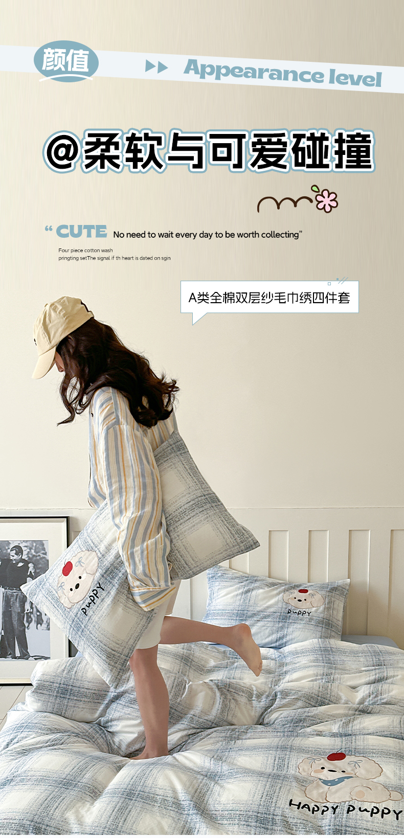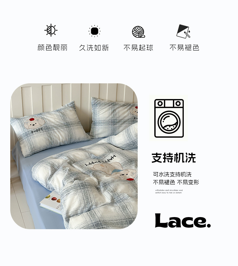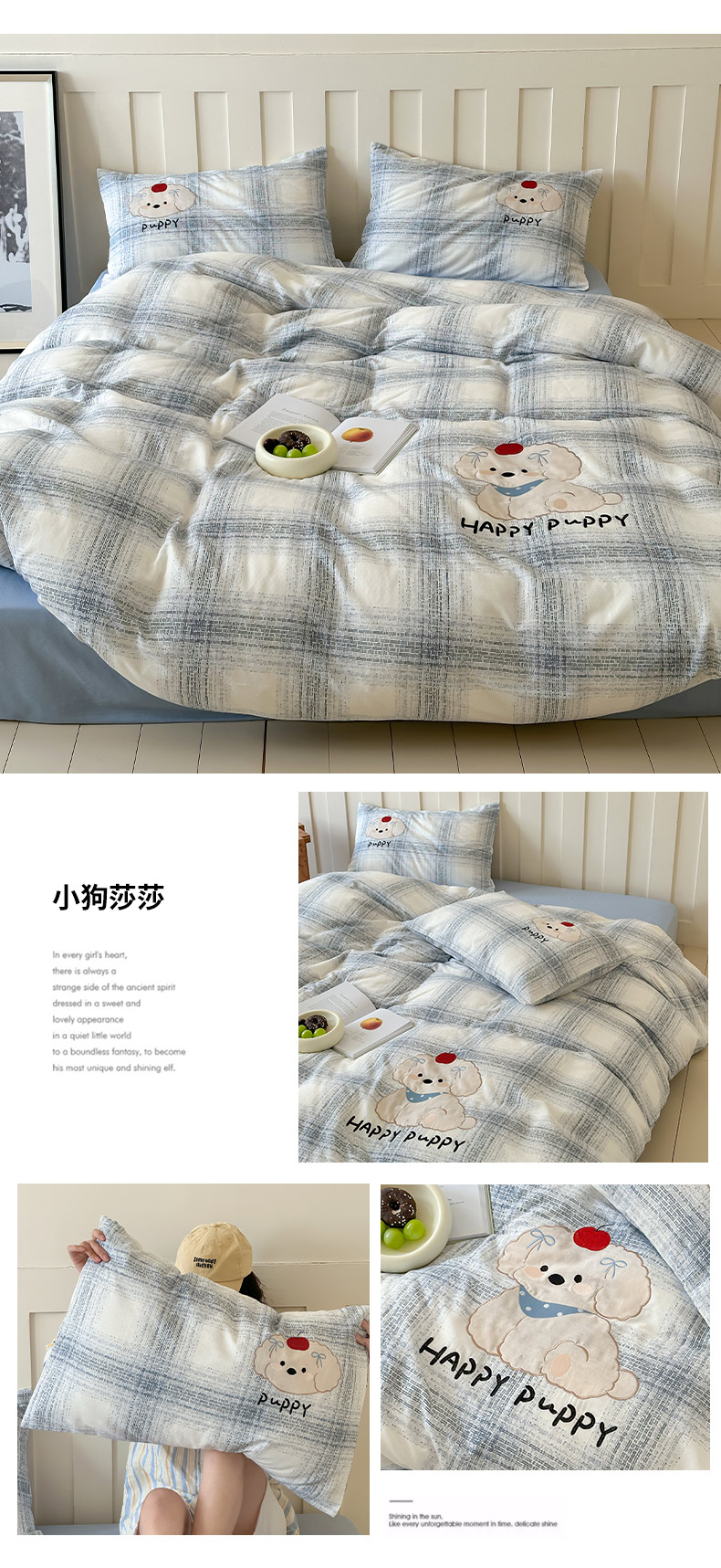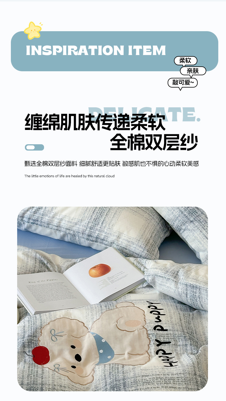 商品名称:圆岛家纺 2025新款全棉双层纱贴布绣四件套 小狗莎莎