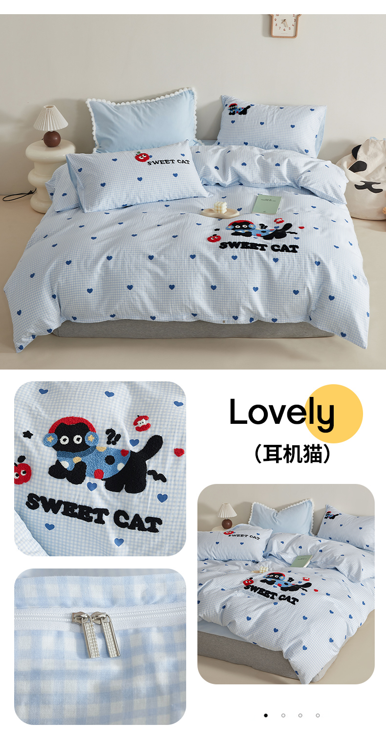 (总)2025新款全棉印花加绣花四件套,斑点狗,举手兔-咖,举手兔-蓝,快乐黑猫,猫小乐,小旺仔,熊小萌