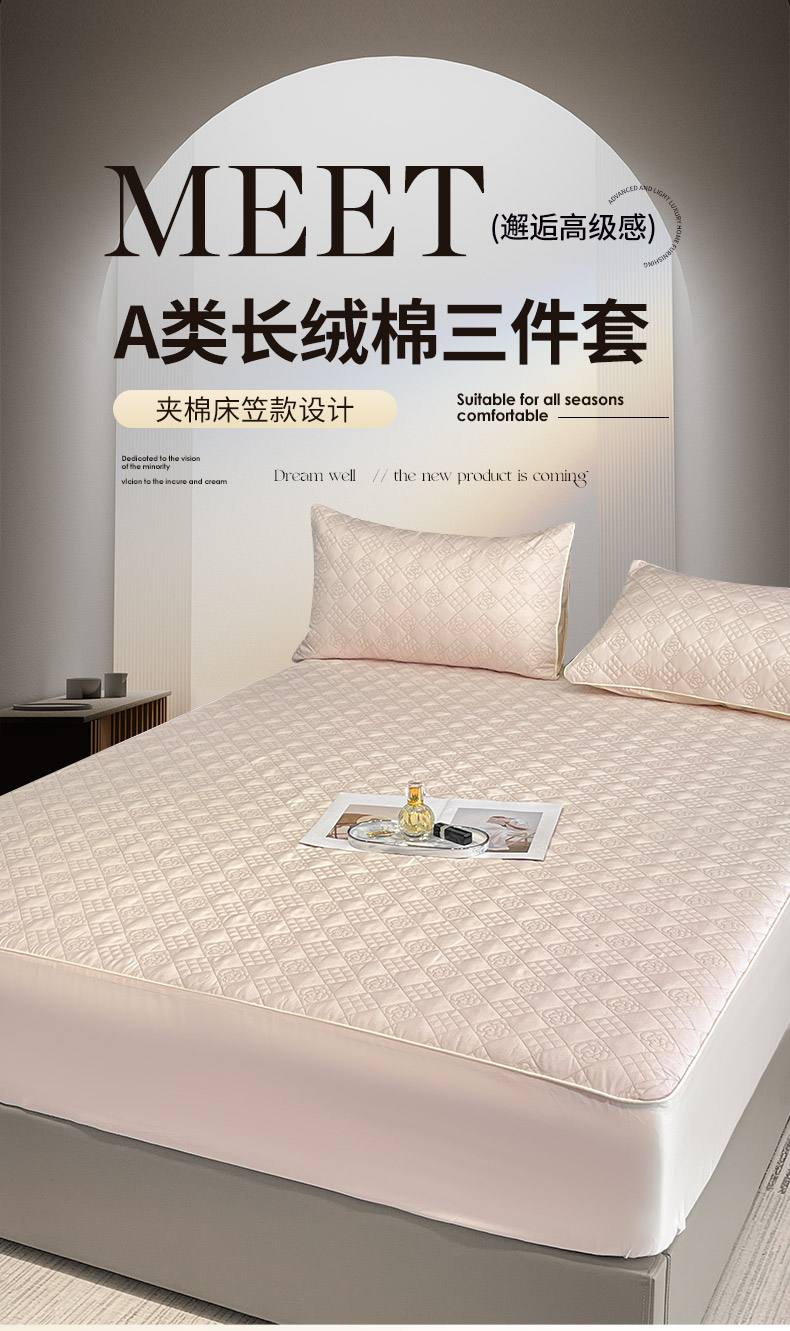 2025A类母婴级长绒棉夹棉床笠三件套纯棉全棉加厚席梦思床罩床套四季款保护罩 颜粉