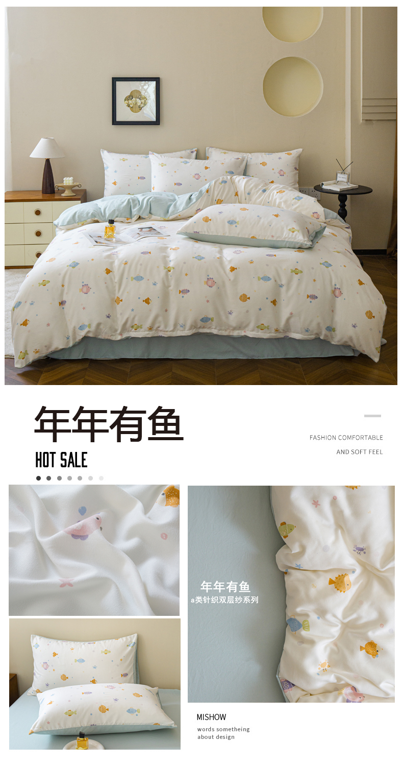 商品名称:斯卡诺家纺 2025新款针织天竺棉水洗棉四件套被套学生宿舍三件套床单款年年有鱼
