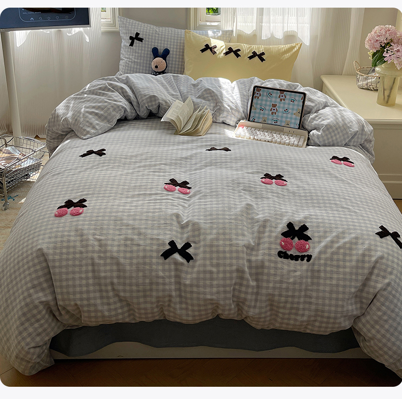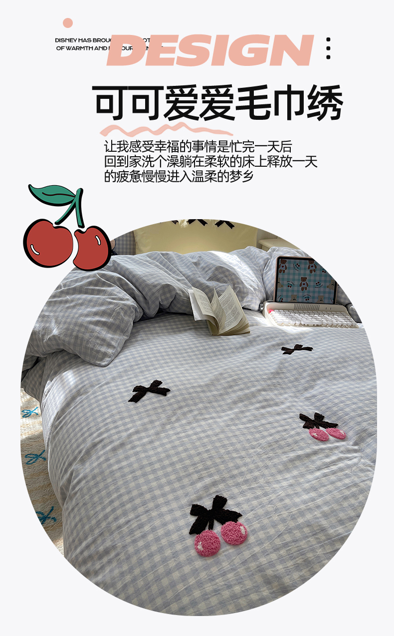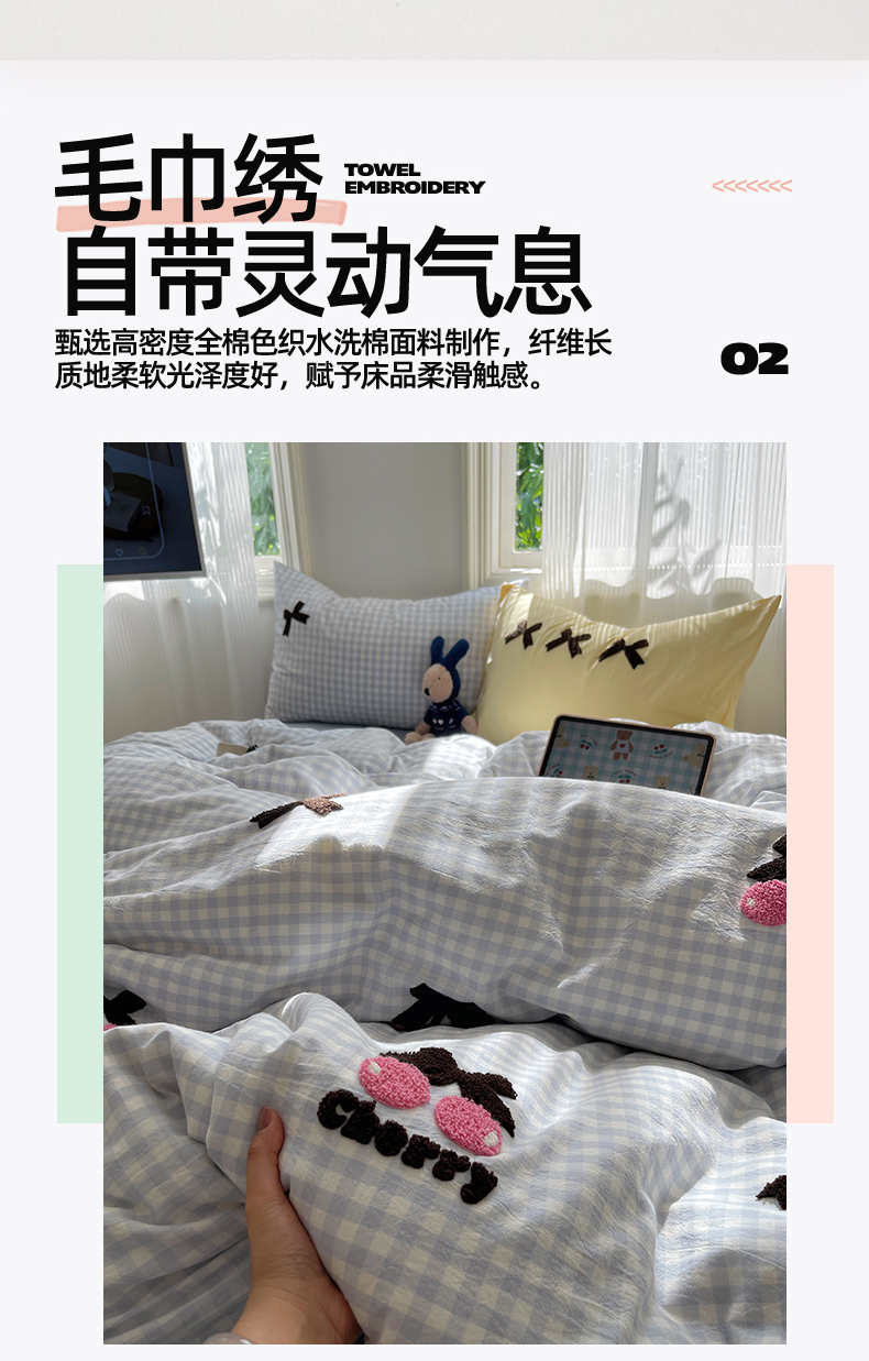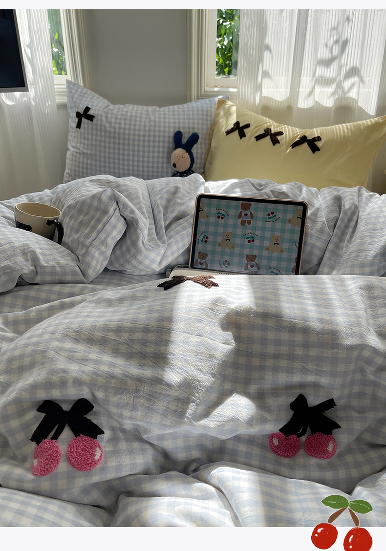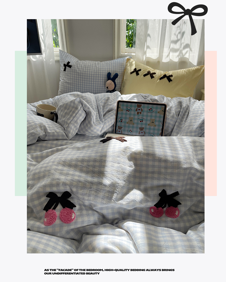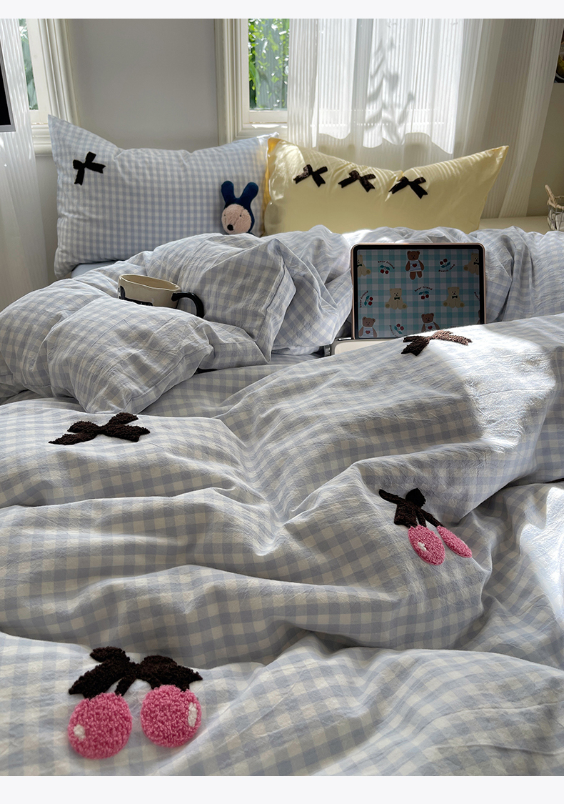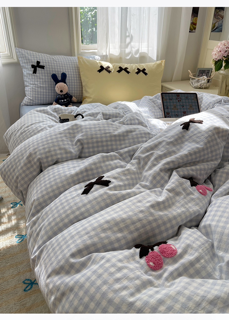 • 91家纺网 家纺一手货源 找家纺 北欧良品 2025新款A类色织水洗棉毛巾绣蝴蝶结少女系列单被套 蝴蝶结-奶油格蓝+蓝黄