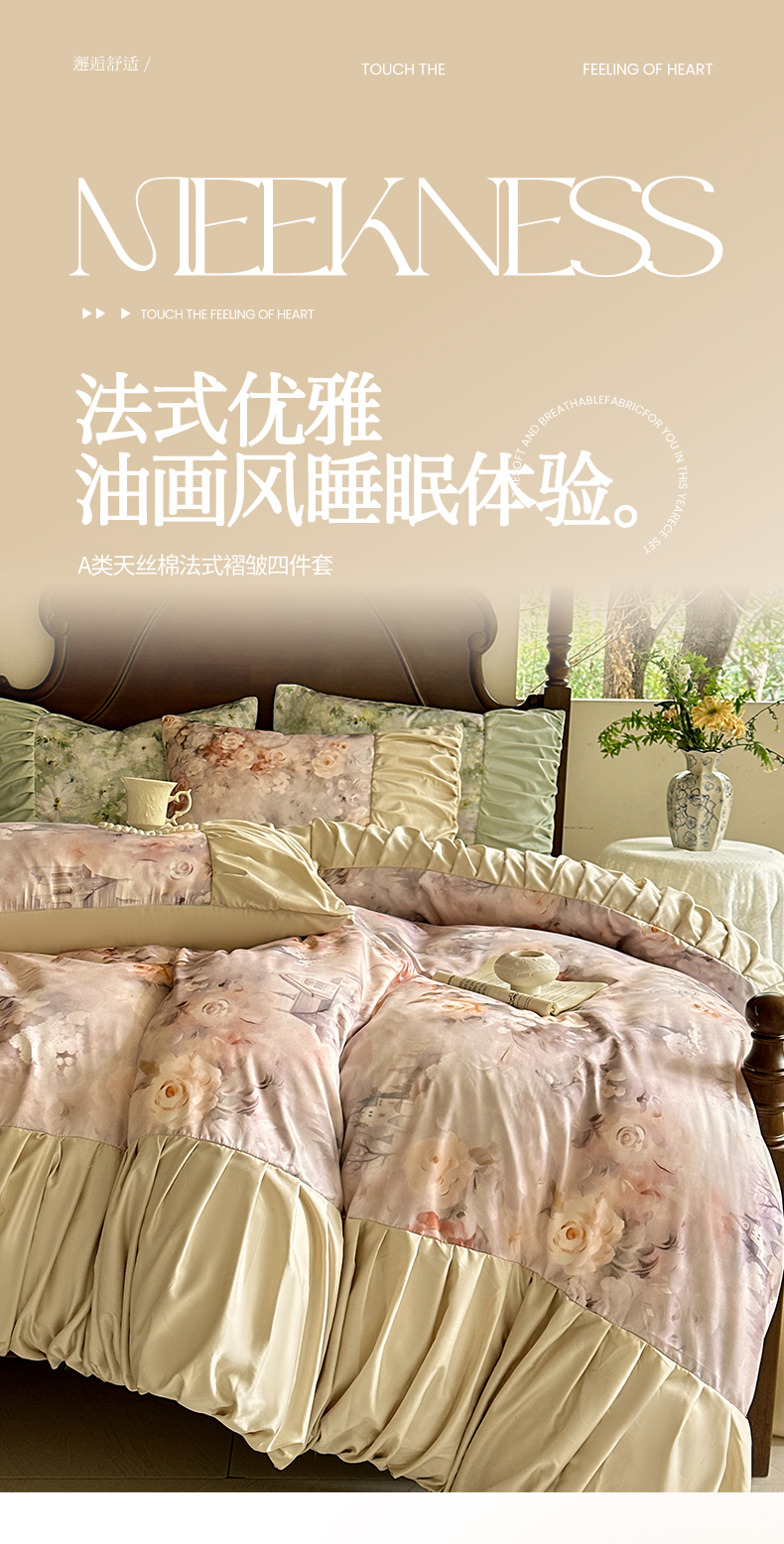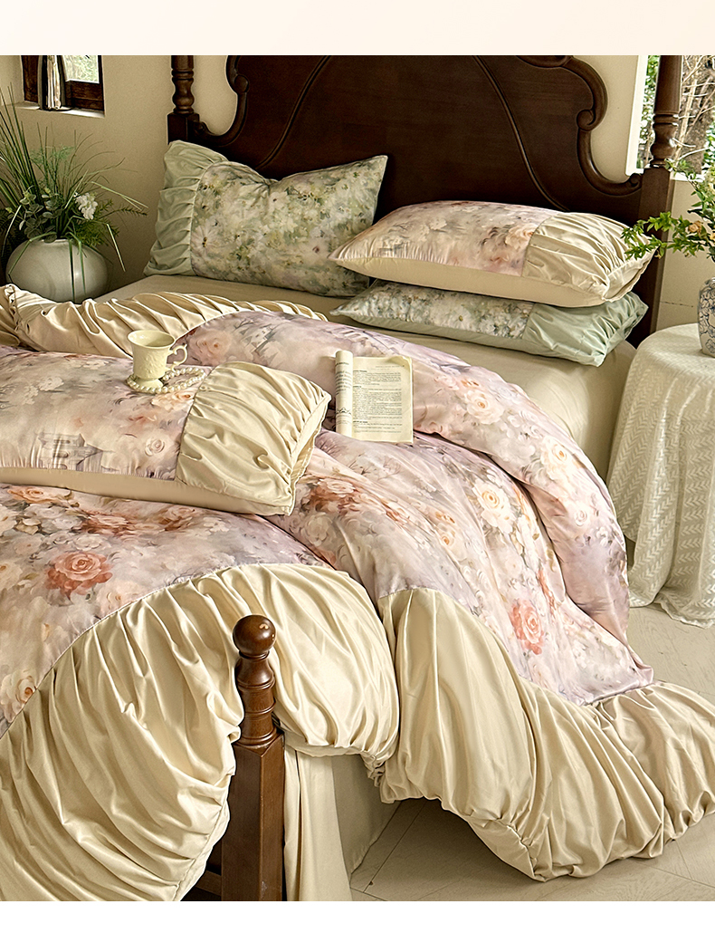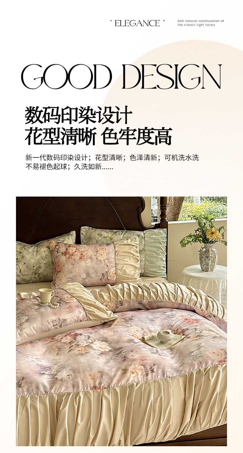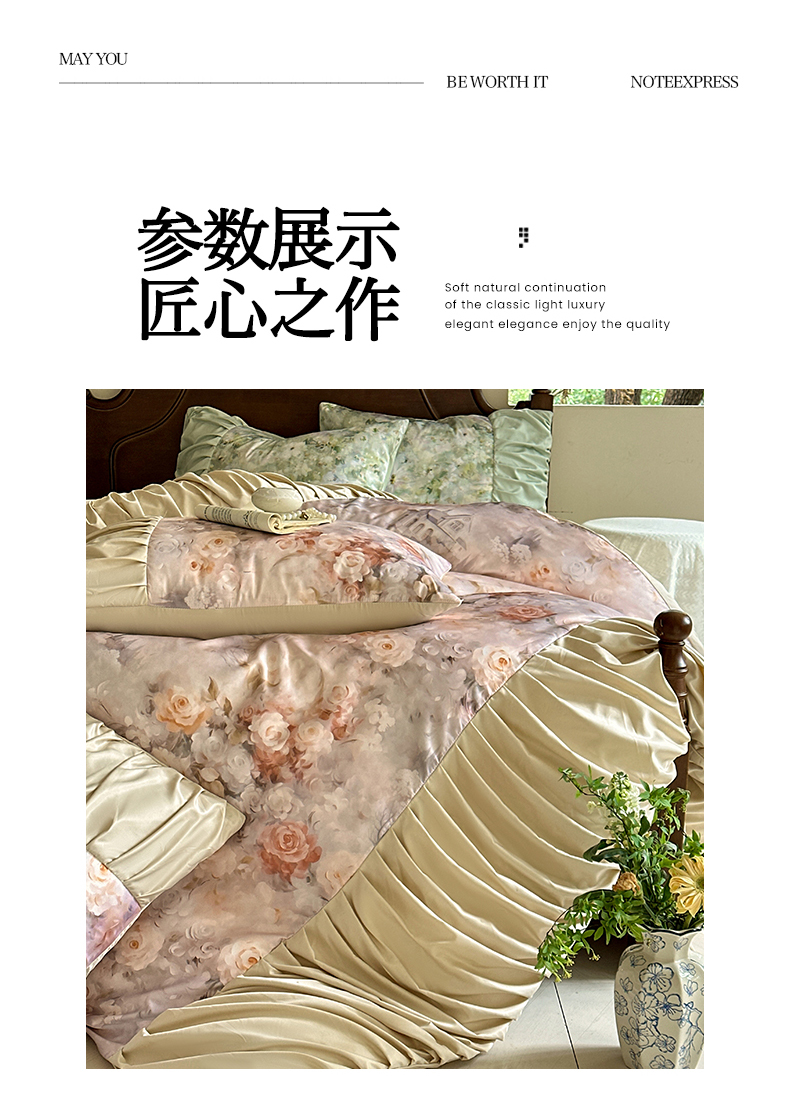 商品名称:艾米家居 2025新款A类天丝棉冰丝法式花边褶皱款四件套 秘密花园皱褶款