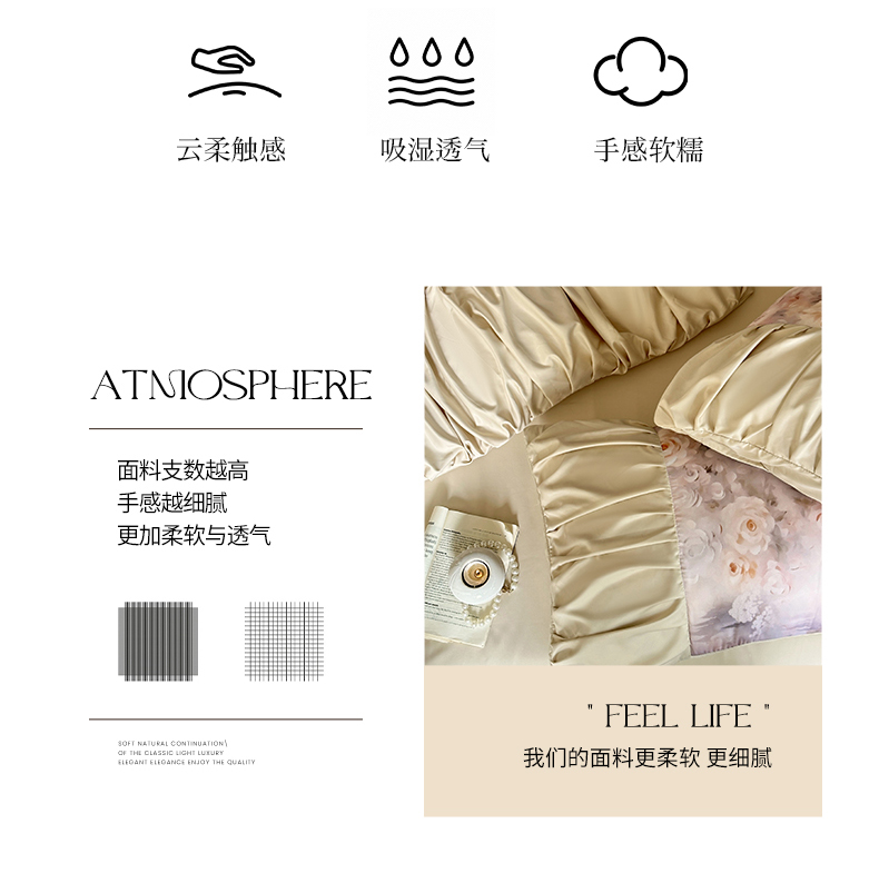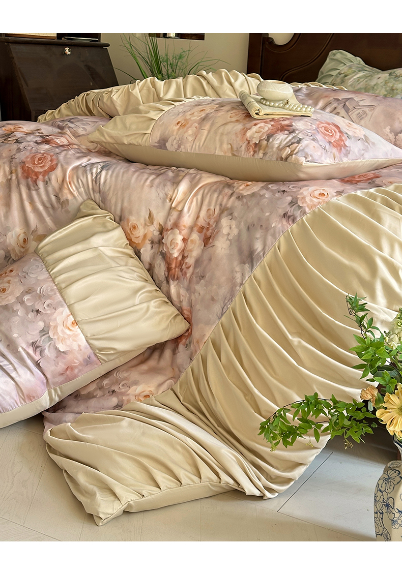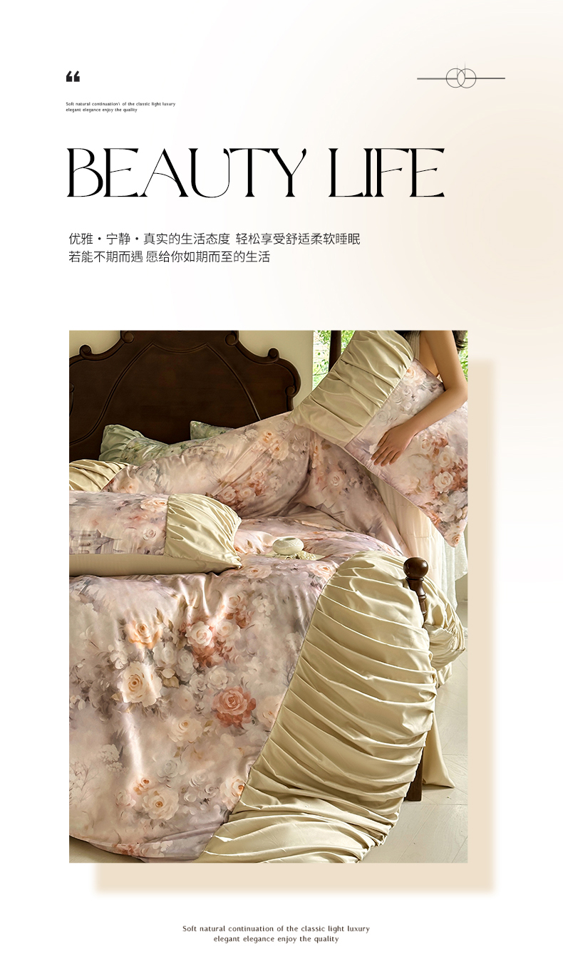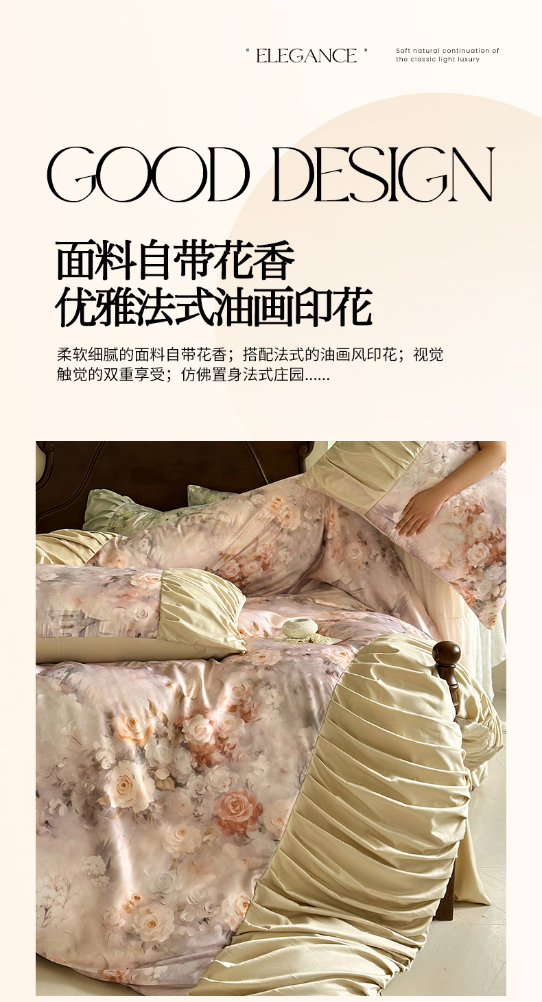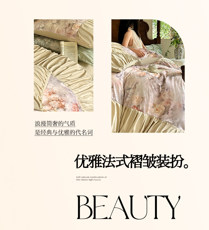 商品名称:艾米家居 2025新款A类天丝棉冰丝法式花边褶皱款四件套 秘密花园皱褶款