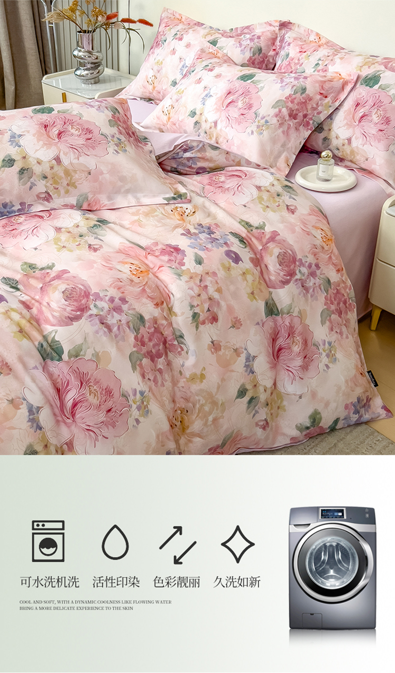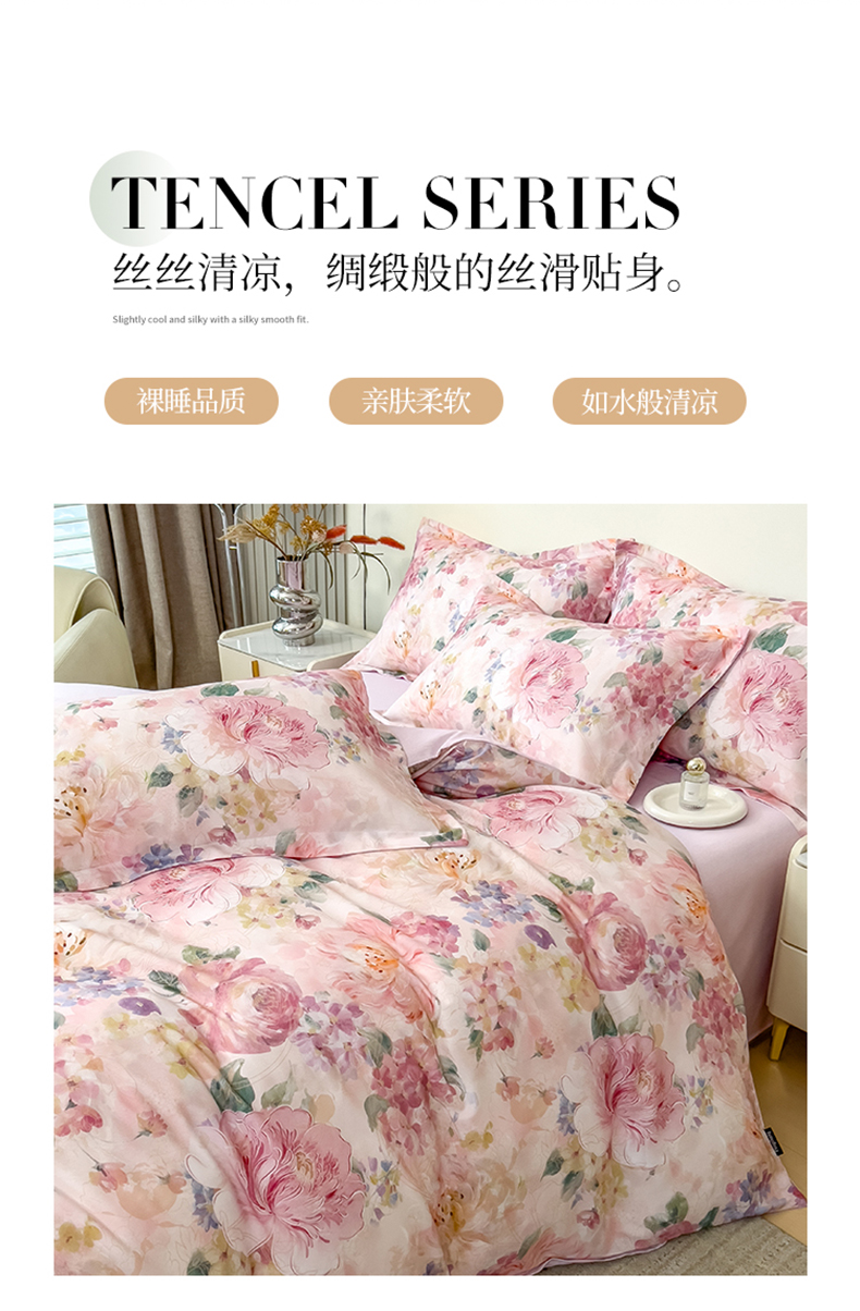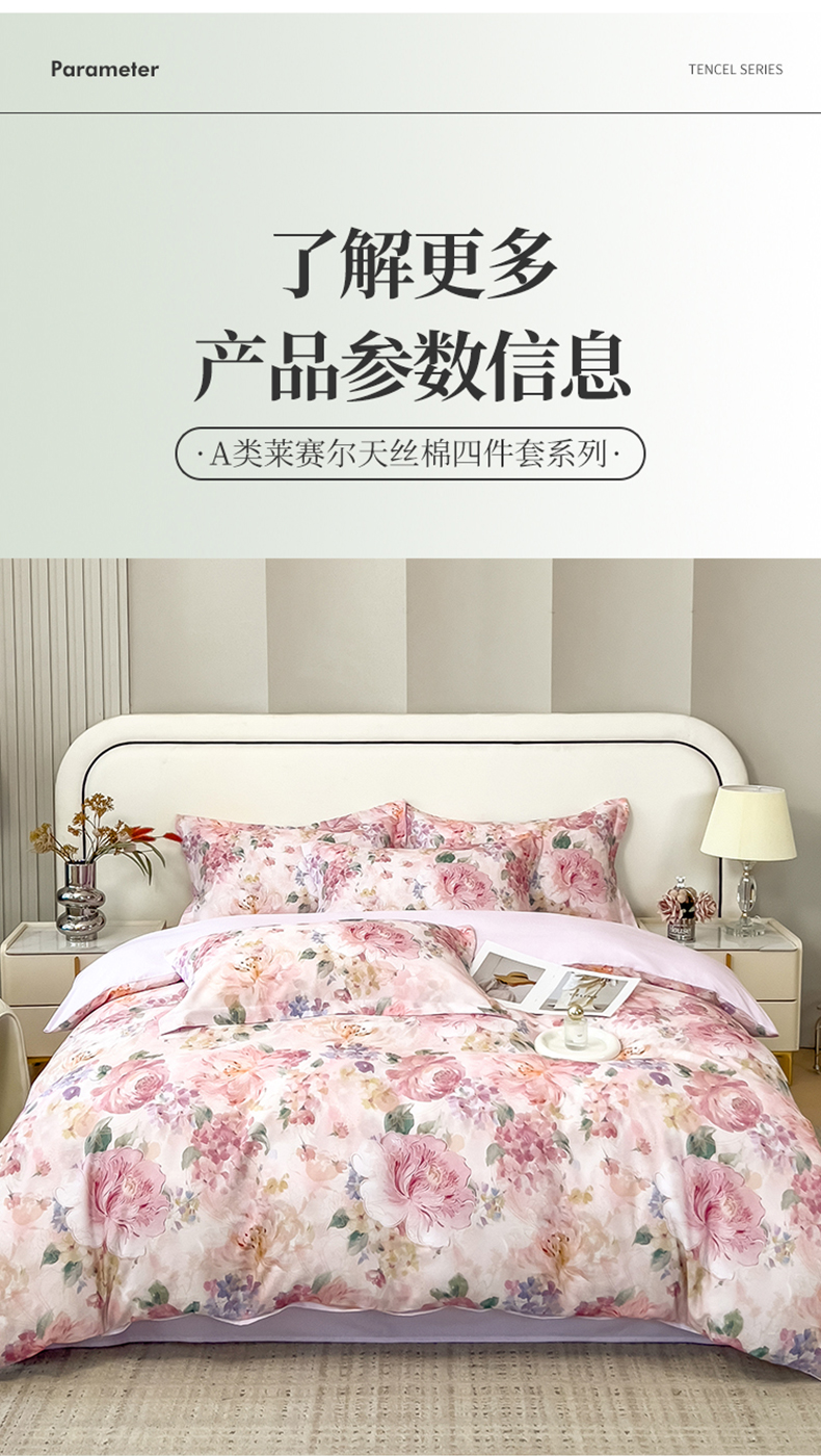 商品名称:芃成家纺 2025新款A类莱赛尔天丝棉四件套 国色花韵-粉