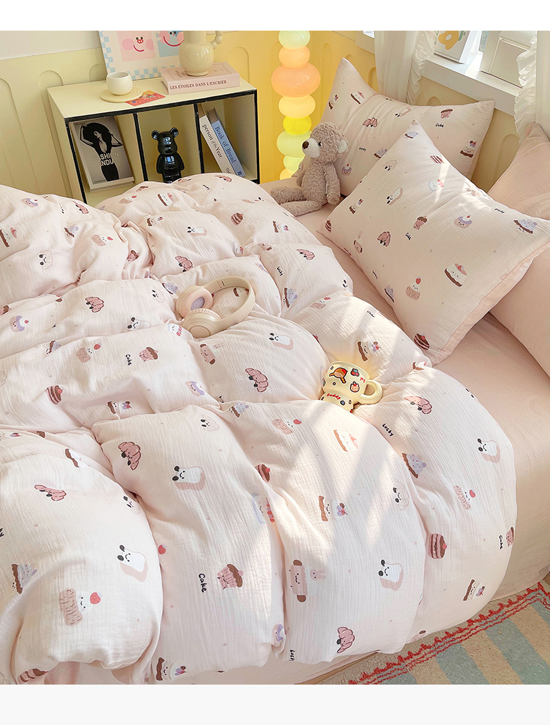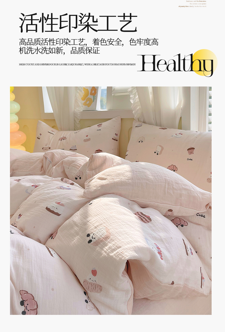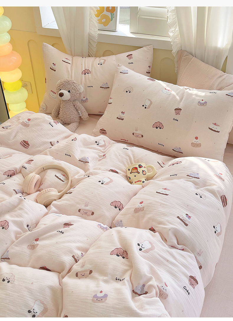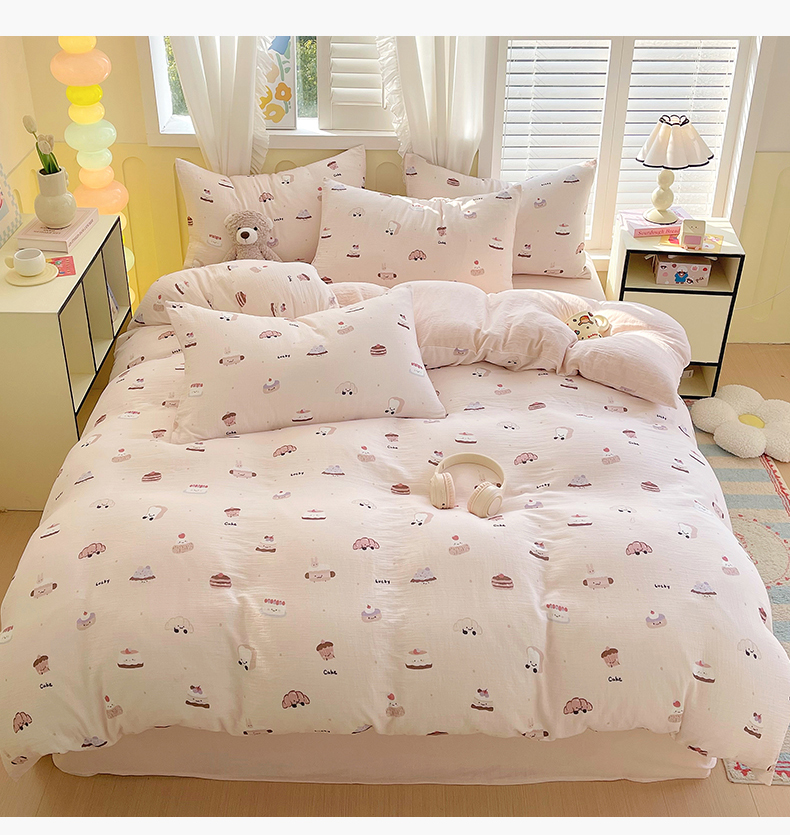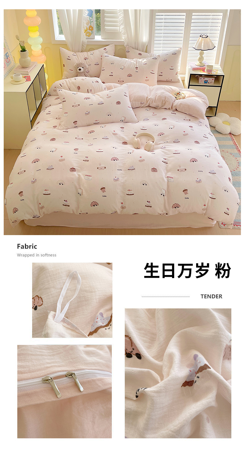 商品名称:凯磊2025新款.纯棉皱皱纱数码印花四件套 生日万岁 粉