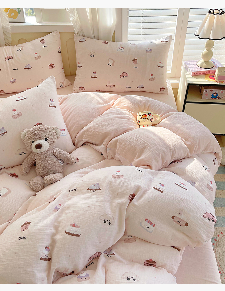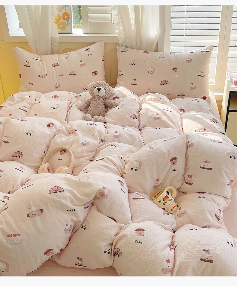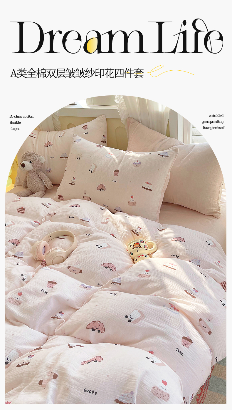 凯磊2025新款.纯棉皱皱纱数码印花四件套 生日万岁 粉