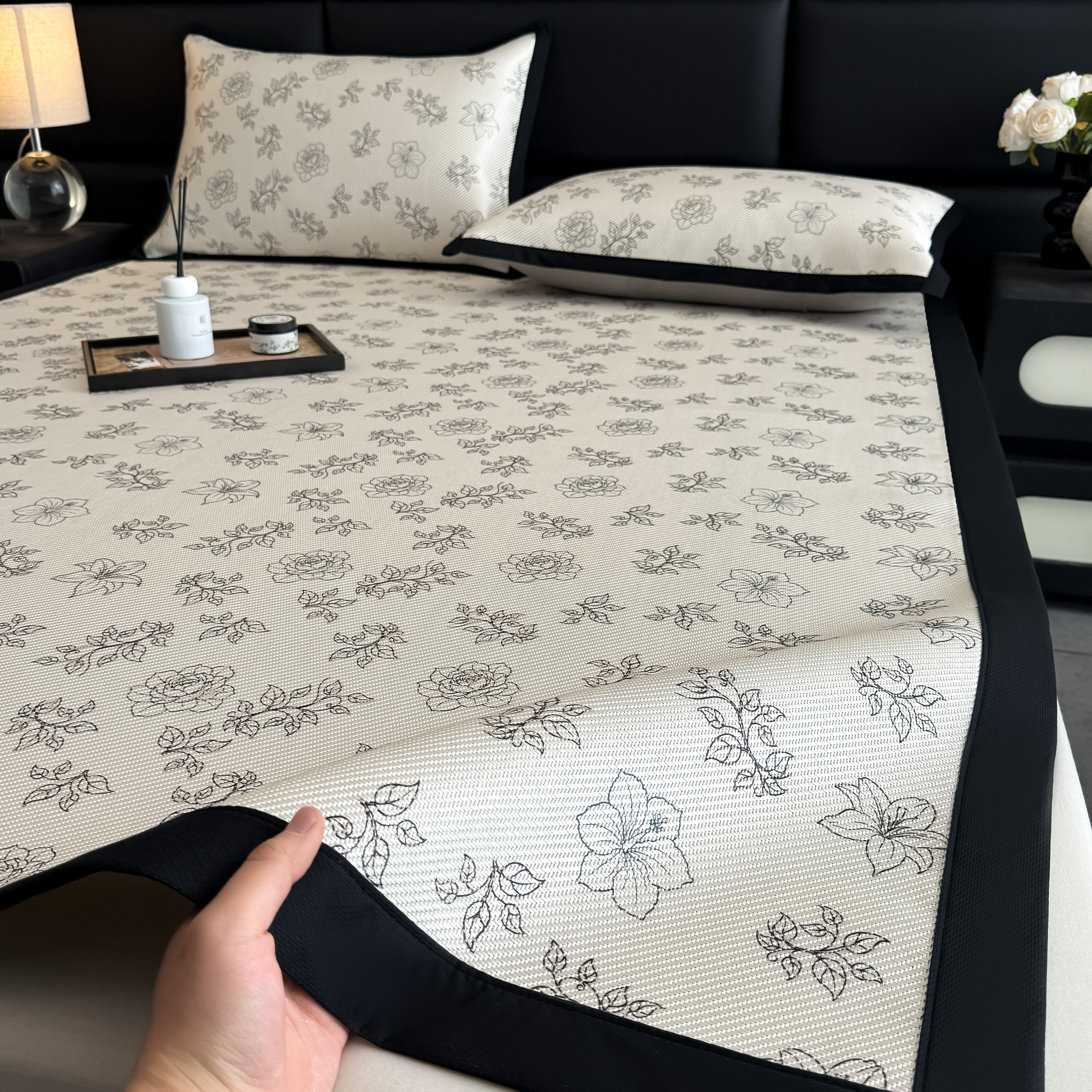 当前位置: 91家纺网 > 商品网购 > 床上用品 > 凉席 > 冰丝席 > 色鬼布艺2025新款赫本风黑边冰藤凉席三件套提供买家秀 莫桑花