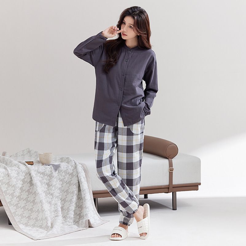 【女士双层纱睡裤】日式无印女士双层纱睡裤良品全棉家居服睡衣裤纯色格纹休闲单长裤,红色格子,黄色格子,紫色格子,绿色格子,紫色纯色,红色纯色,黄色纯色,绿色纯色