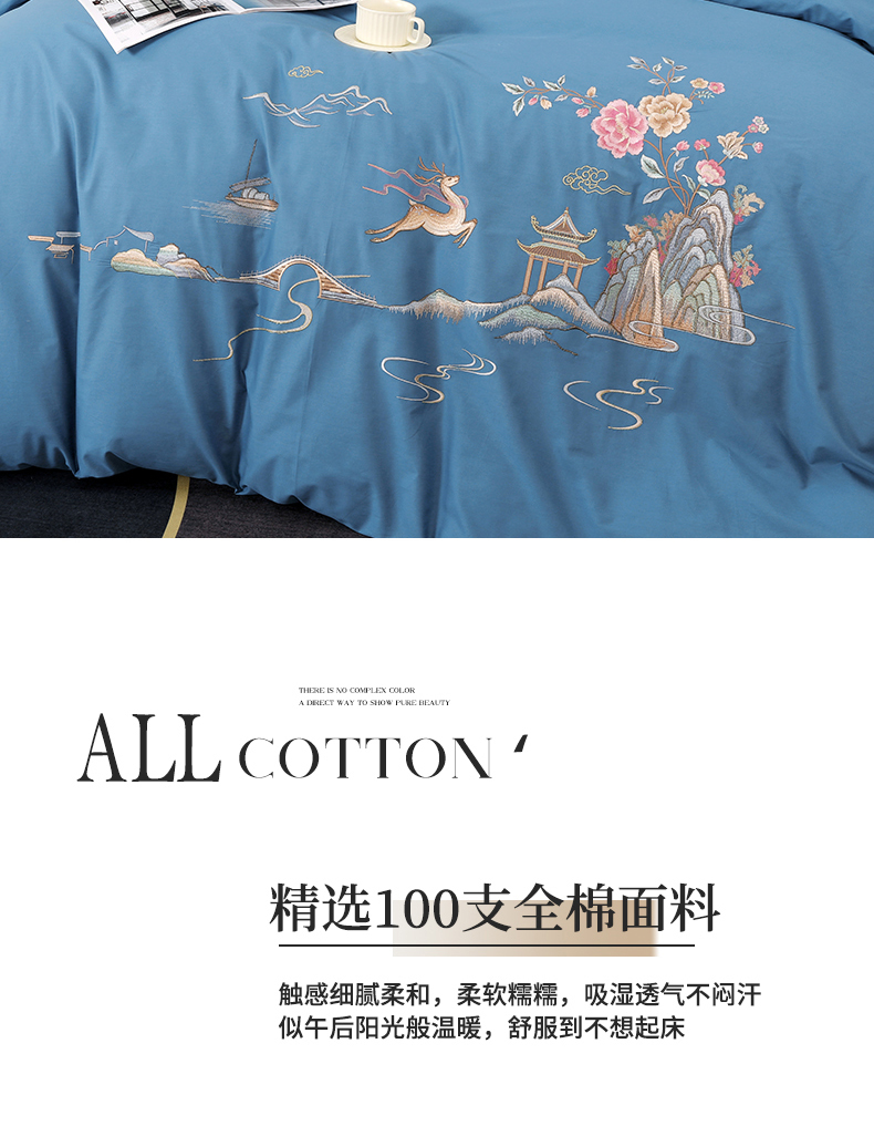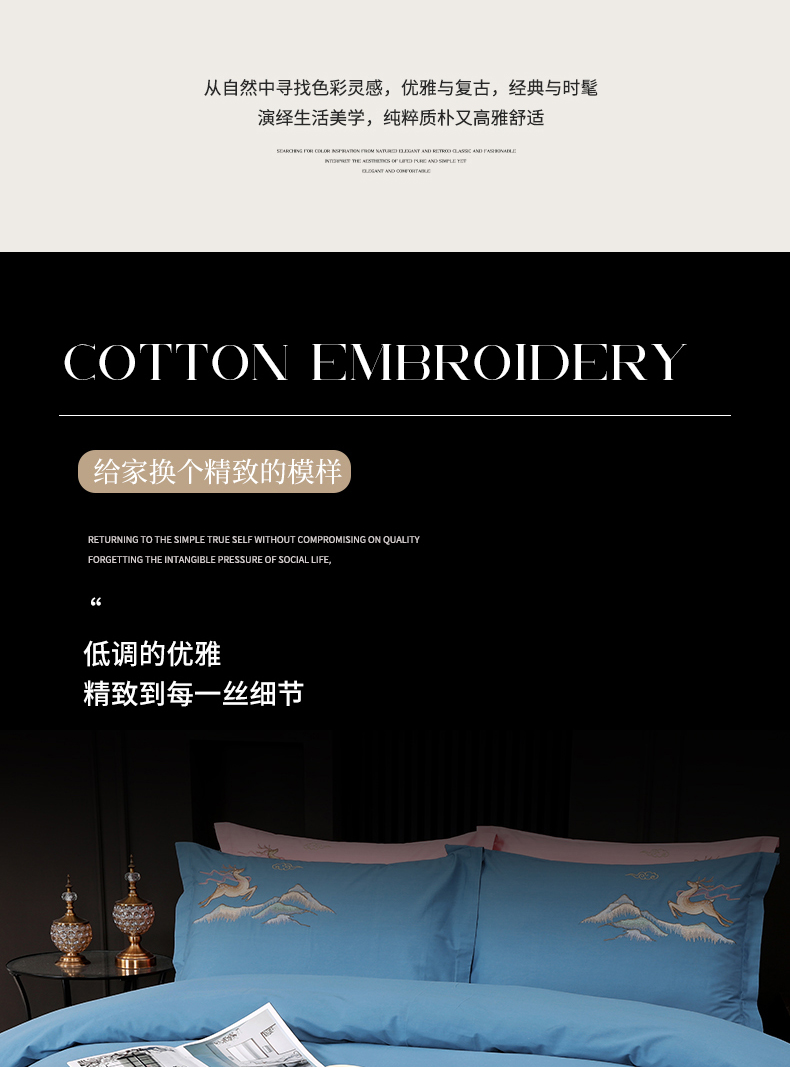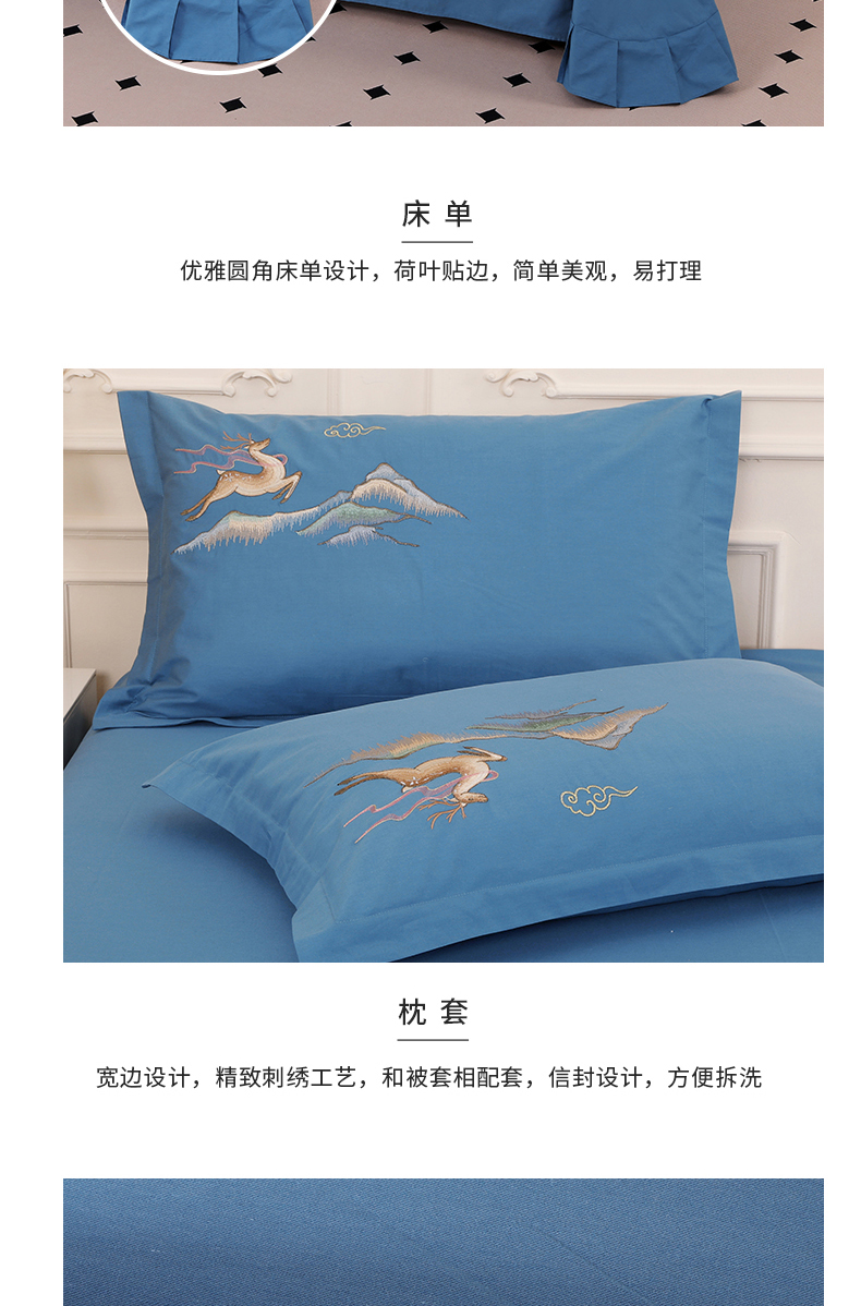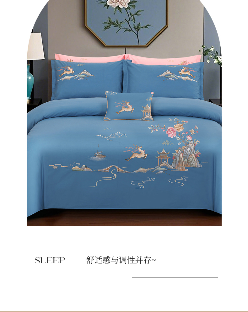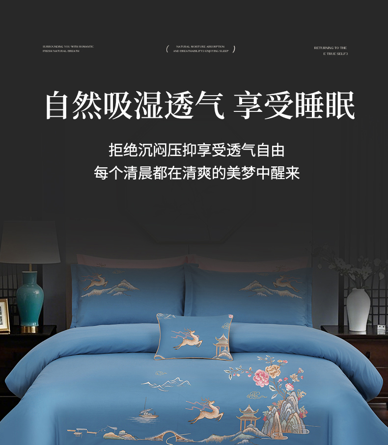 商品名称:浩情国际婚庆供货中心 2026新款100支全棉高端刺绣四件套一鹿常红系列 一鹿常红-蓝灰
