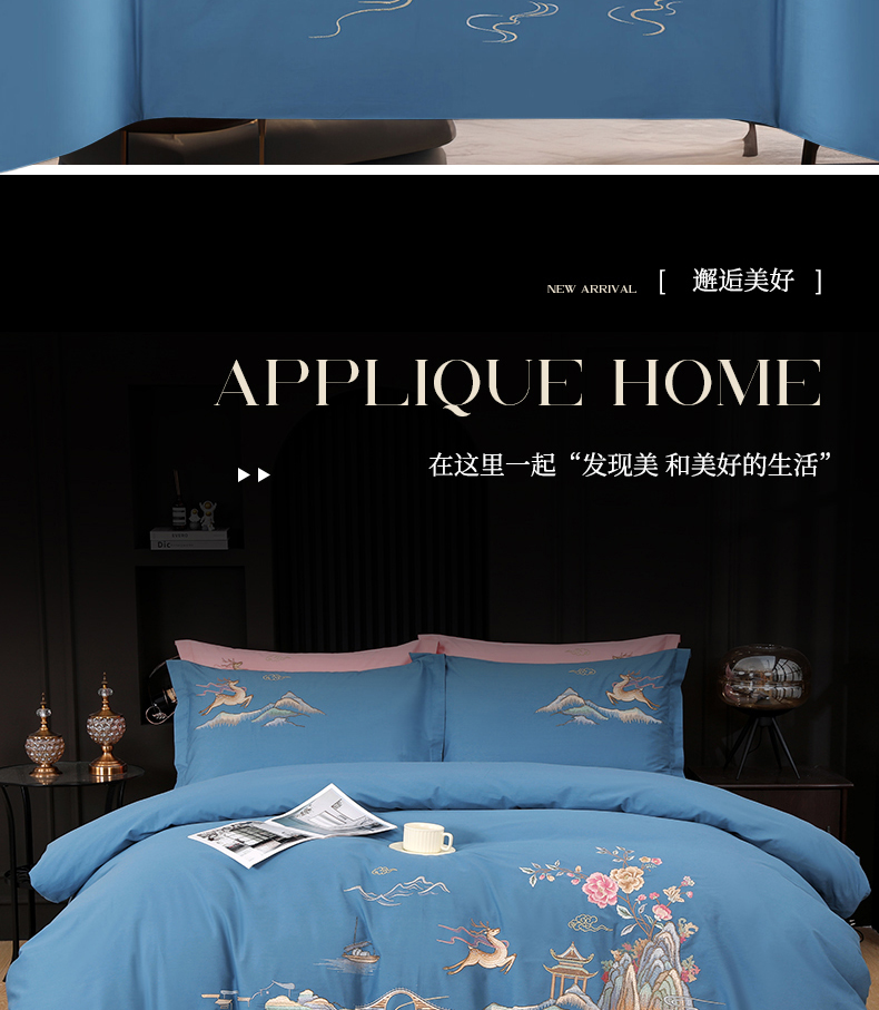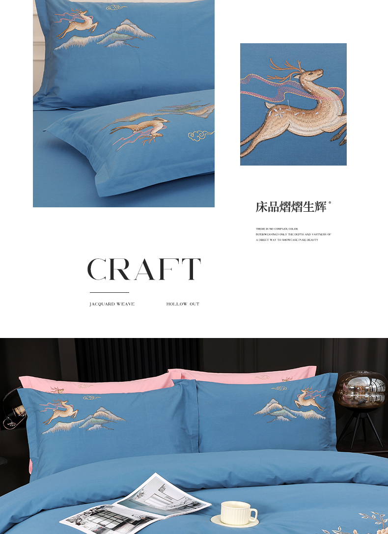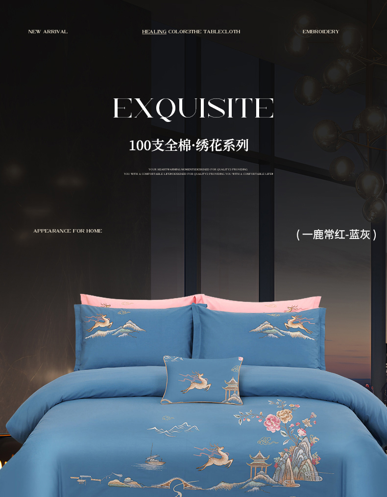 浩情国际婚庆供货中心 2026新款100支全棉高端刺绣四件套一鹿常红系列 一鹿常红-蓝灰