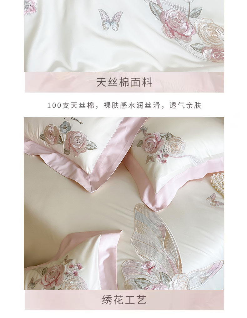 (总)佳汐蓝家纺 2025春夏新款天丝棉蝶舞繁花绣花天丝四件套,蝶舞繁花·粉,蝶舞繁花·蓝
