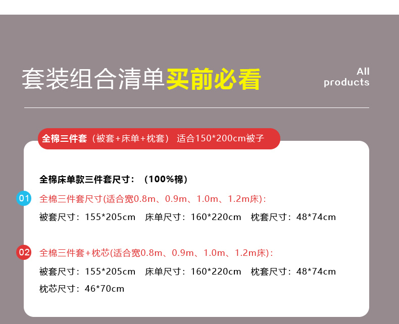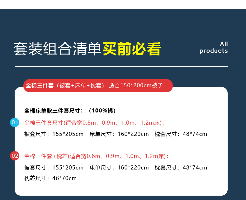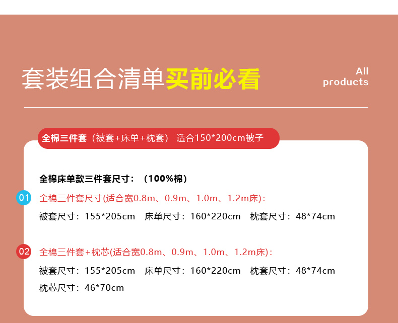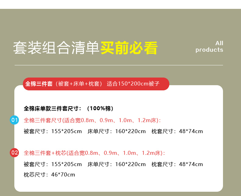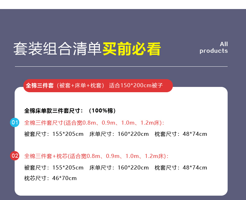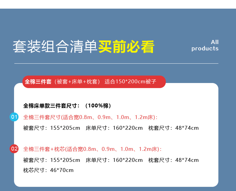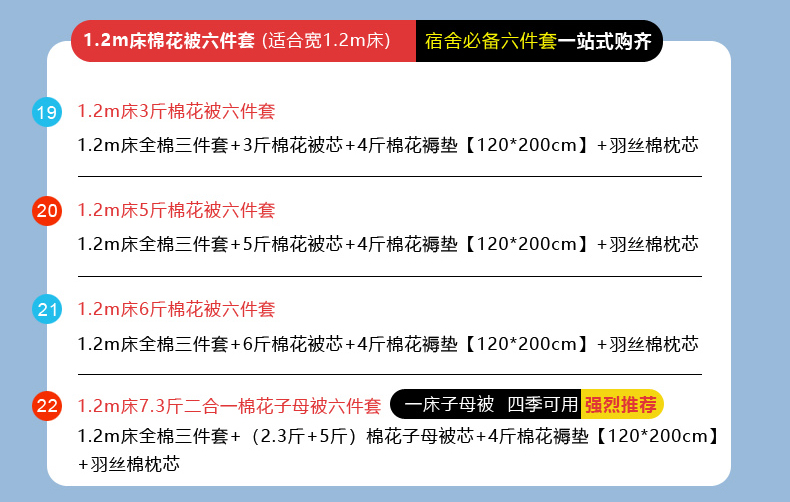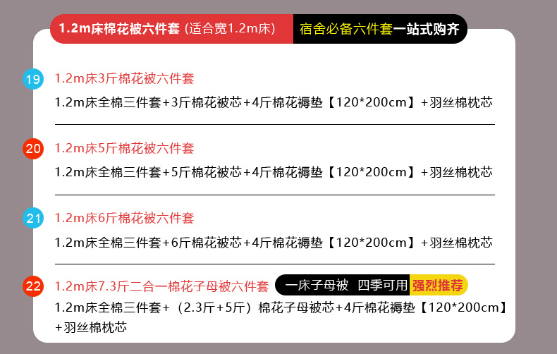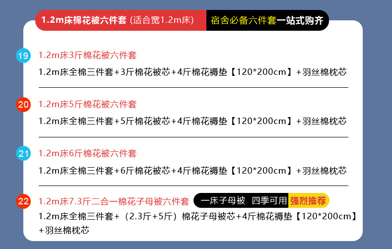 1.2m床5斤棉花被六件套(全棉三件套+5斤新疆棉花被+4斤棉花垫被+枕芯)