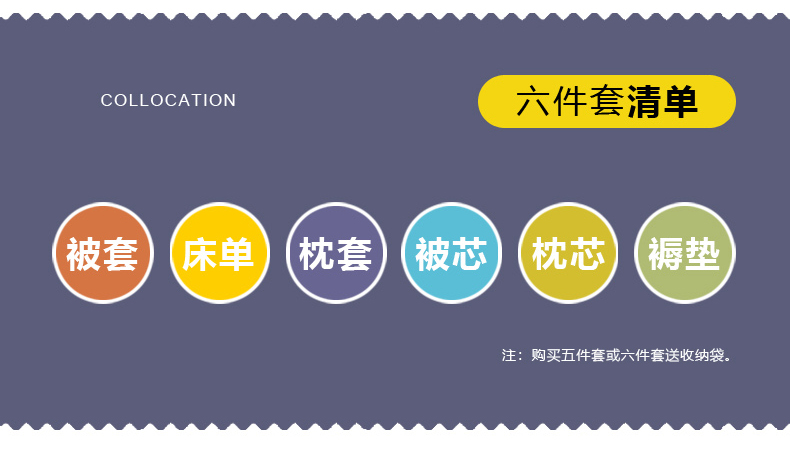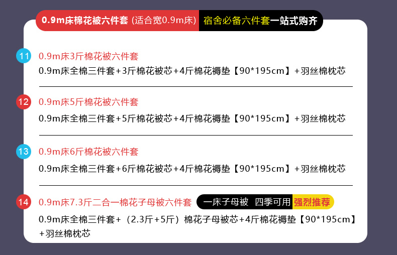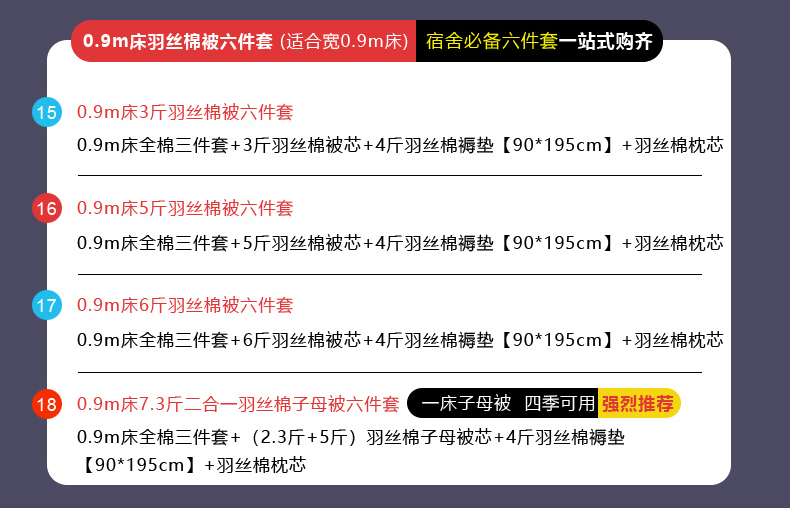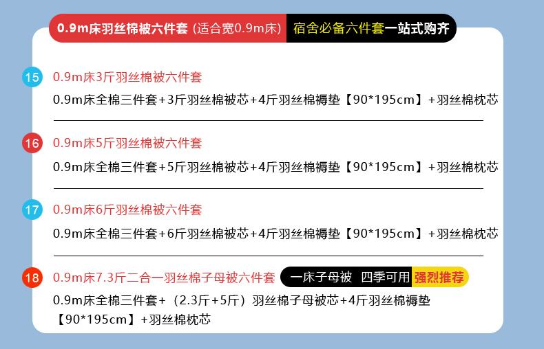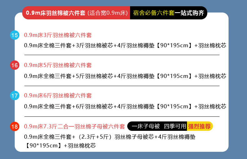 0.9m床3斤羽丝棉被六件套(全棉三件套+3斤羽丝棉被+4斤羽丝棉垫被+枕芯)