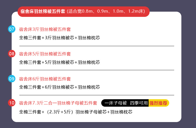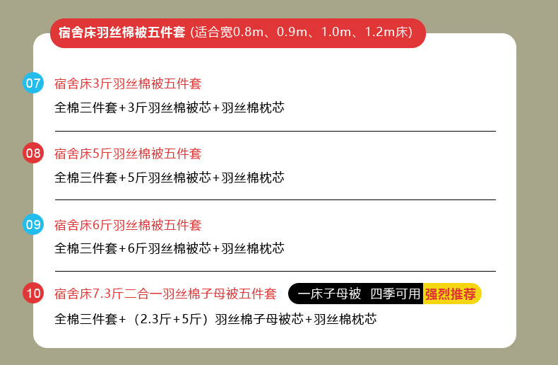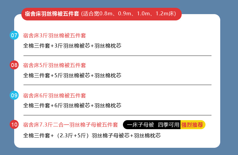 0.9m床7.3斤羽丝棉被五件套(全棉三件套+7.3斤羽丝棉被+枕芯)