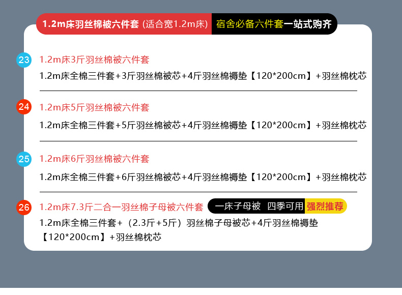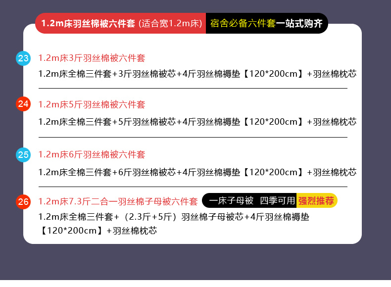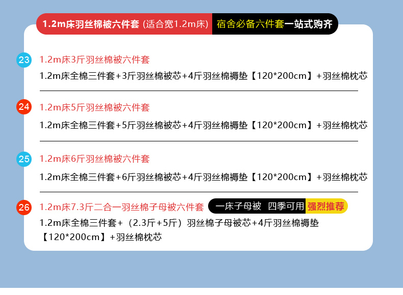 1.2m床3斤羽丝棉被六件套(全棉三件套+3斤羽丝棉被+4斤羽丝棉垫被+枕芯)