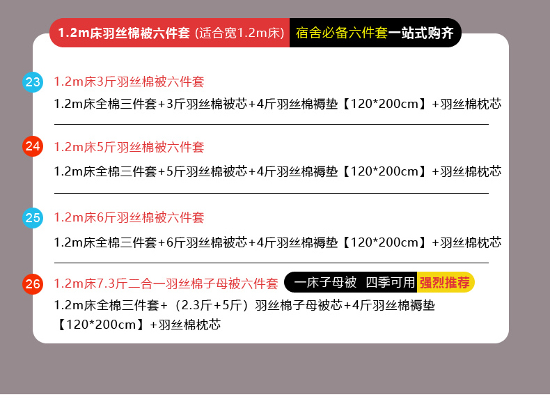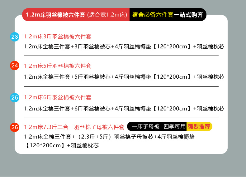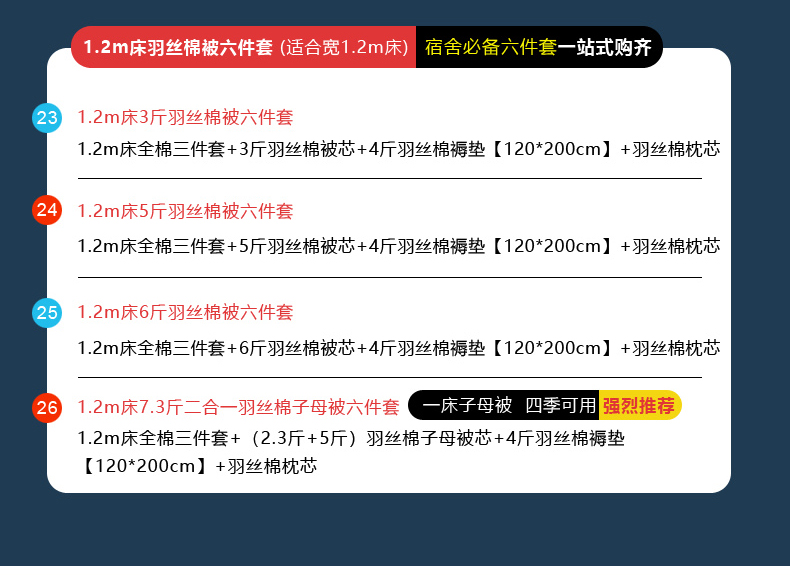 1.2m床5斤羽丝棉被六件套(全棉三件套+5斤羽丝棉被+4斤羽丝棉垫被+枕芯)