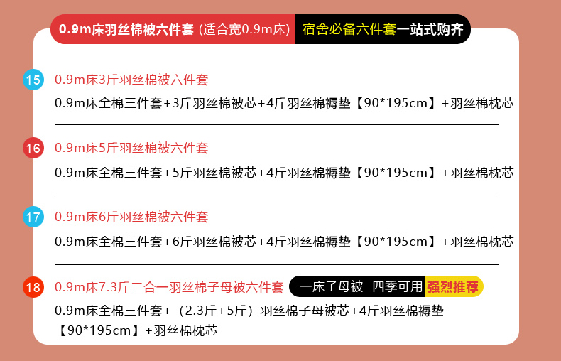 0.9m床7.3斤羽丝棉子母被六件套(全棉三件套+7.3斤羽丝棉子母被+4斤羽丝棉垫被+枕芯)