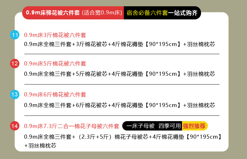 0.9m床7.3斤棉花子母被六件套(全棉三件套+7.3斤新疆棉花子母被+4斤棉花垫被+枕芯)