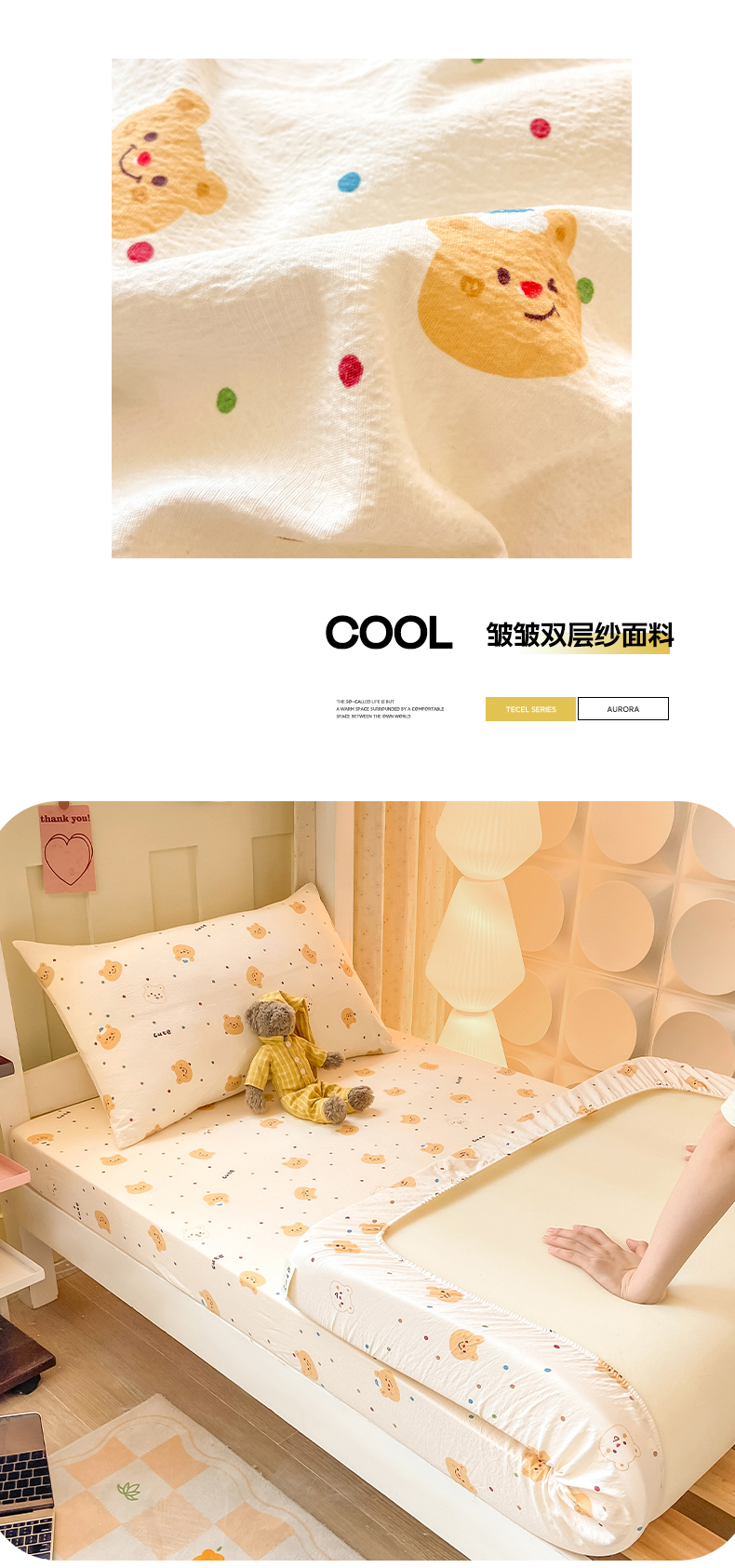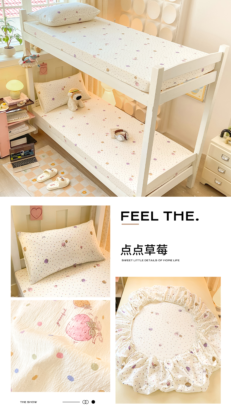 • 91家纺网 家纺一手货源 找家纺 眠势力 2025新款ins云感双层纱学生宿舍上下铺奶油风云感四季款单床笠床笠单件 波点小熊