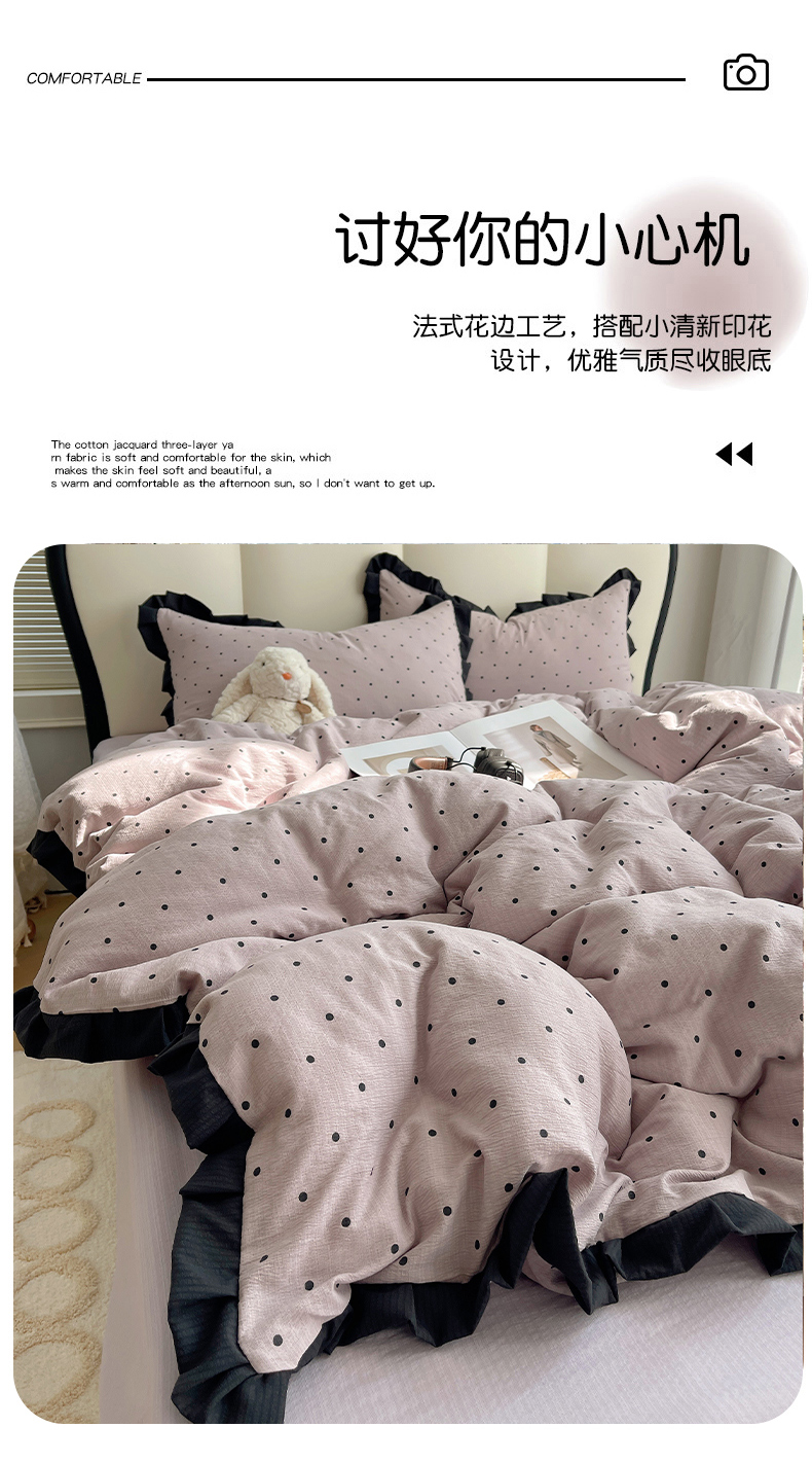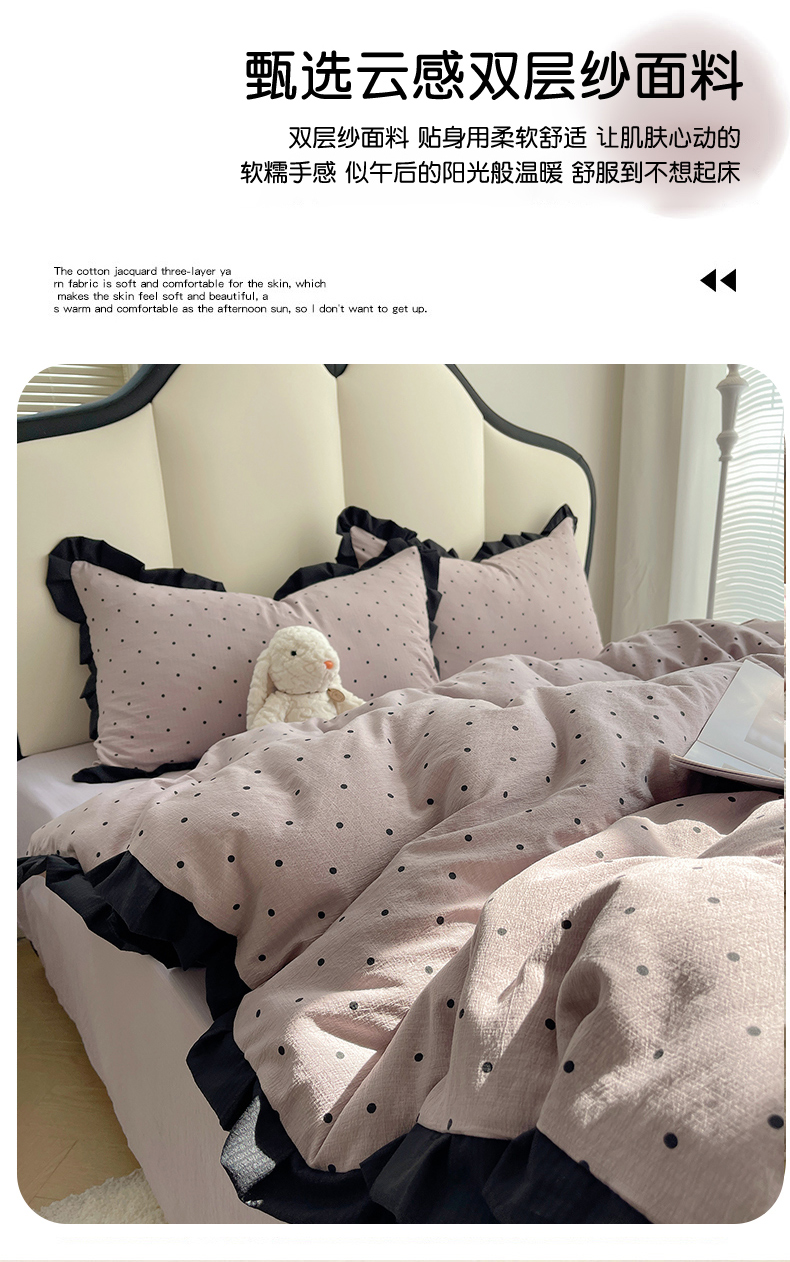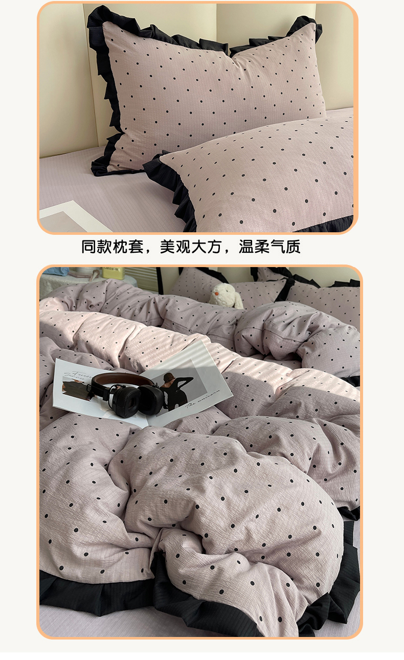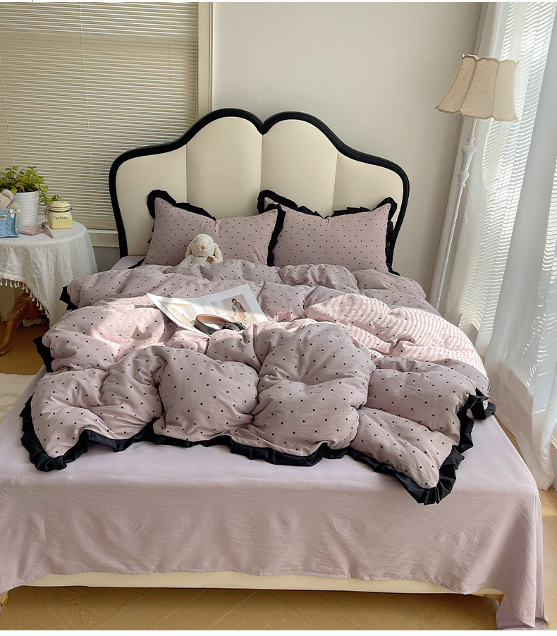 当前位置: 91家纺网 > 商品网购 > 床品套件 > 四件套 > 其它四件套 > 韩巢家纺 2025新款黑皱皱双层纱花边款被套四件套直播热销款学生宿舍床单三件套-(提供卖家秀) 黑丁香紫波点【黑皱皱花边款】
