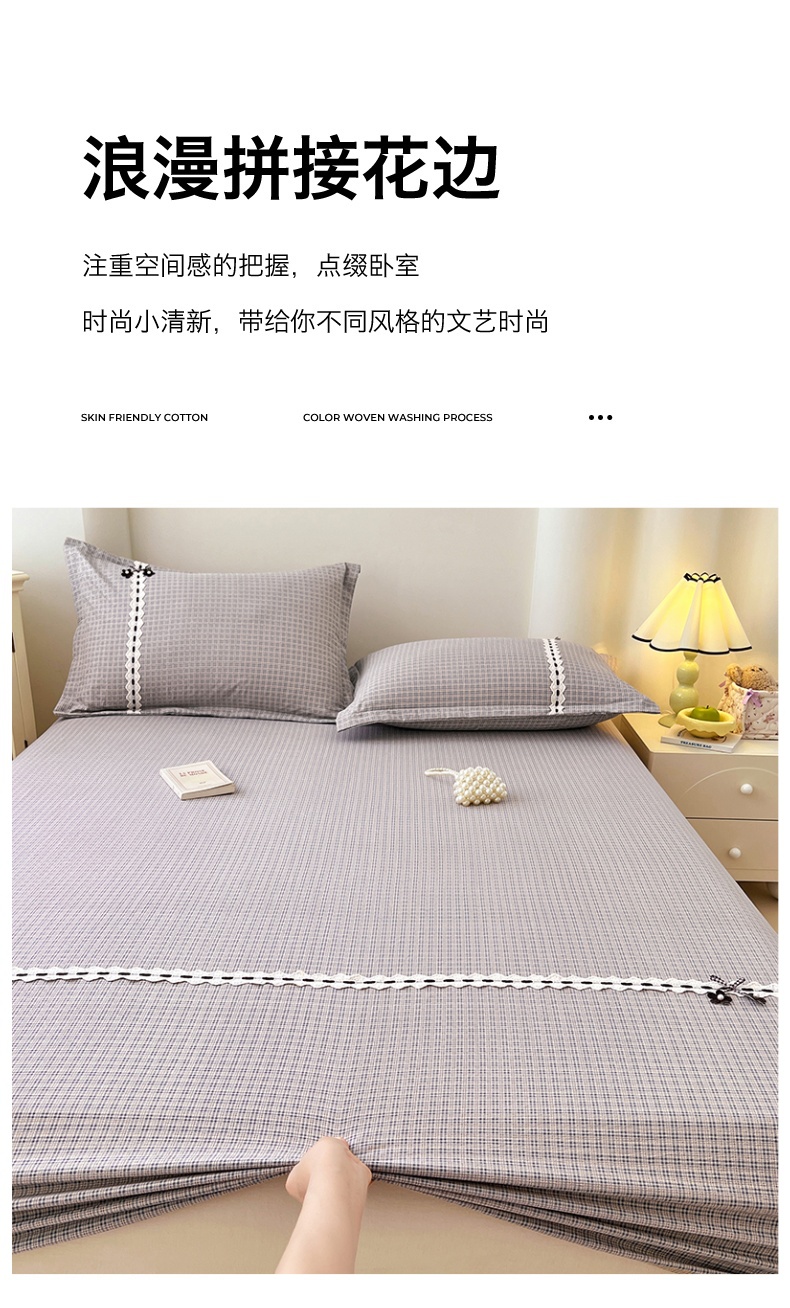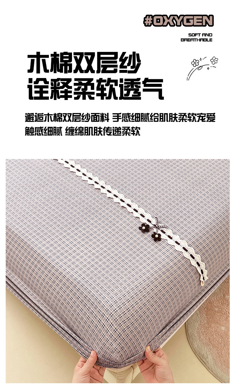 • 91家纺网 家纺一手货源 找家纺 梦舒羽 2025新款双层纱格子花边床笠防滑蕾丝床罩床垫保护套榻榻米宿舍三件套 花边款-明古灰格