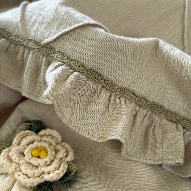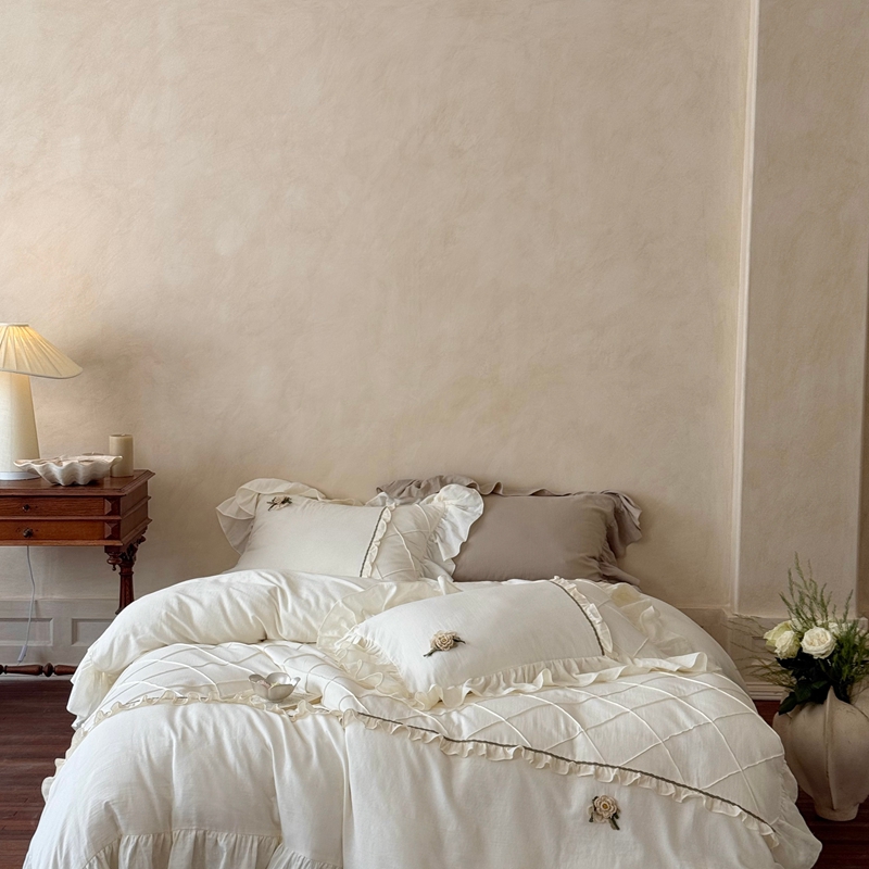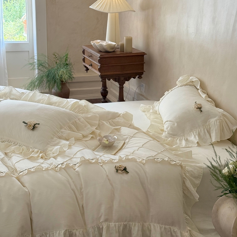 (总)佳汐蓝 2025春夏新品双层皱皱纱刺绣+织带+荷叶边四件套--白茶花,奶白,曲奇