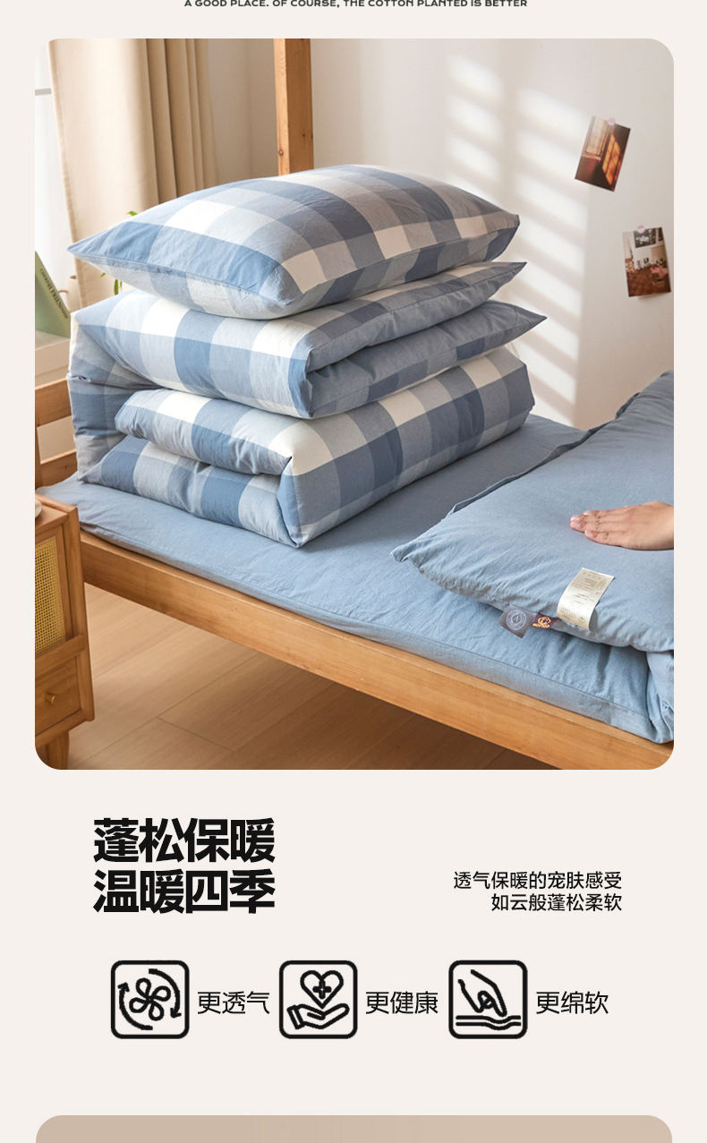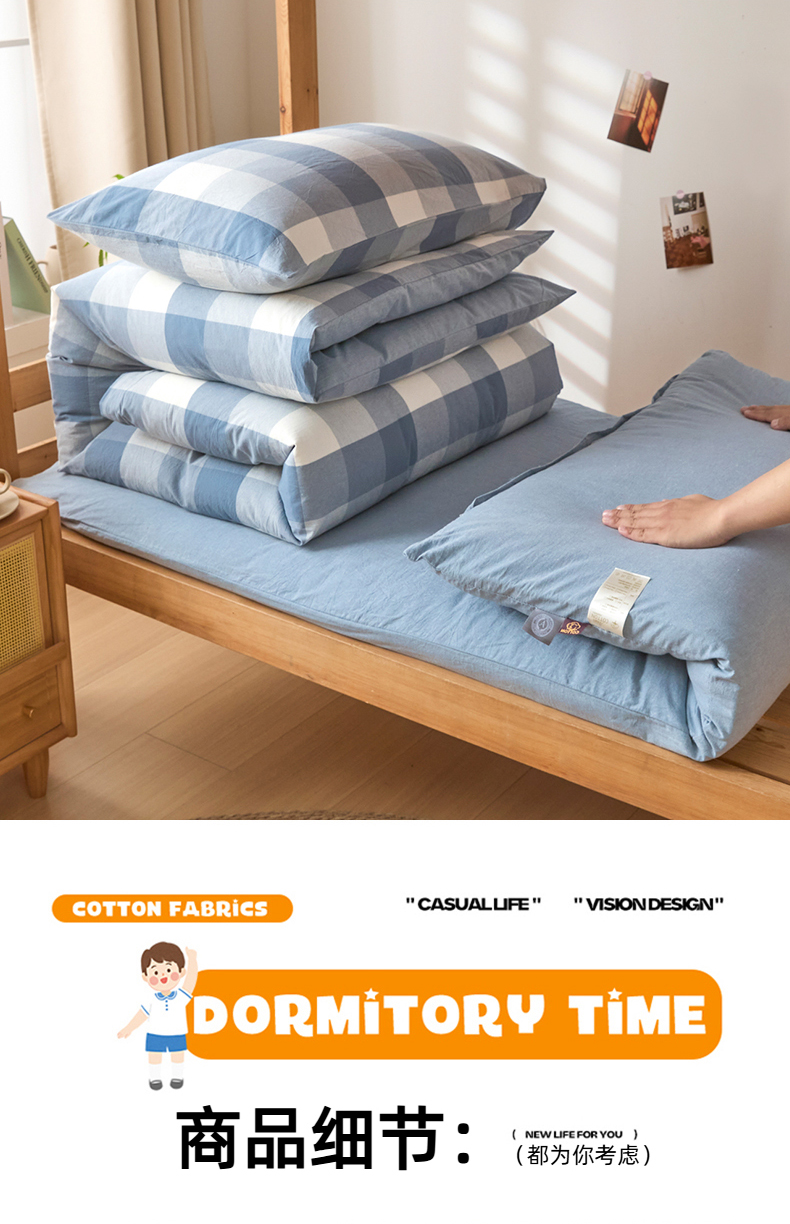 商品名称:爱屋及屋 2025新款水洗棉学生季大礼包学生宿舍六件套棉花被+棉花垫子+枕头+三件套一站式全套 蓝中格