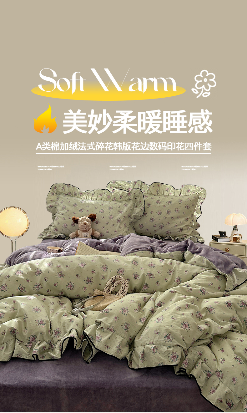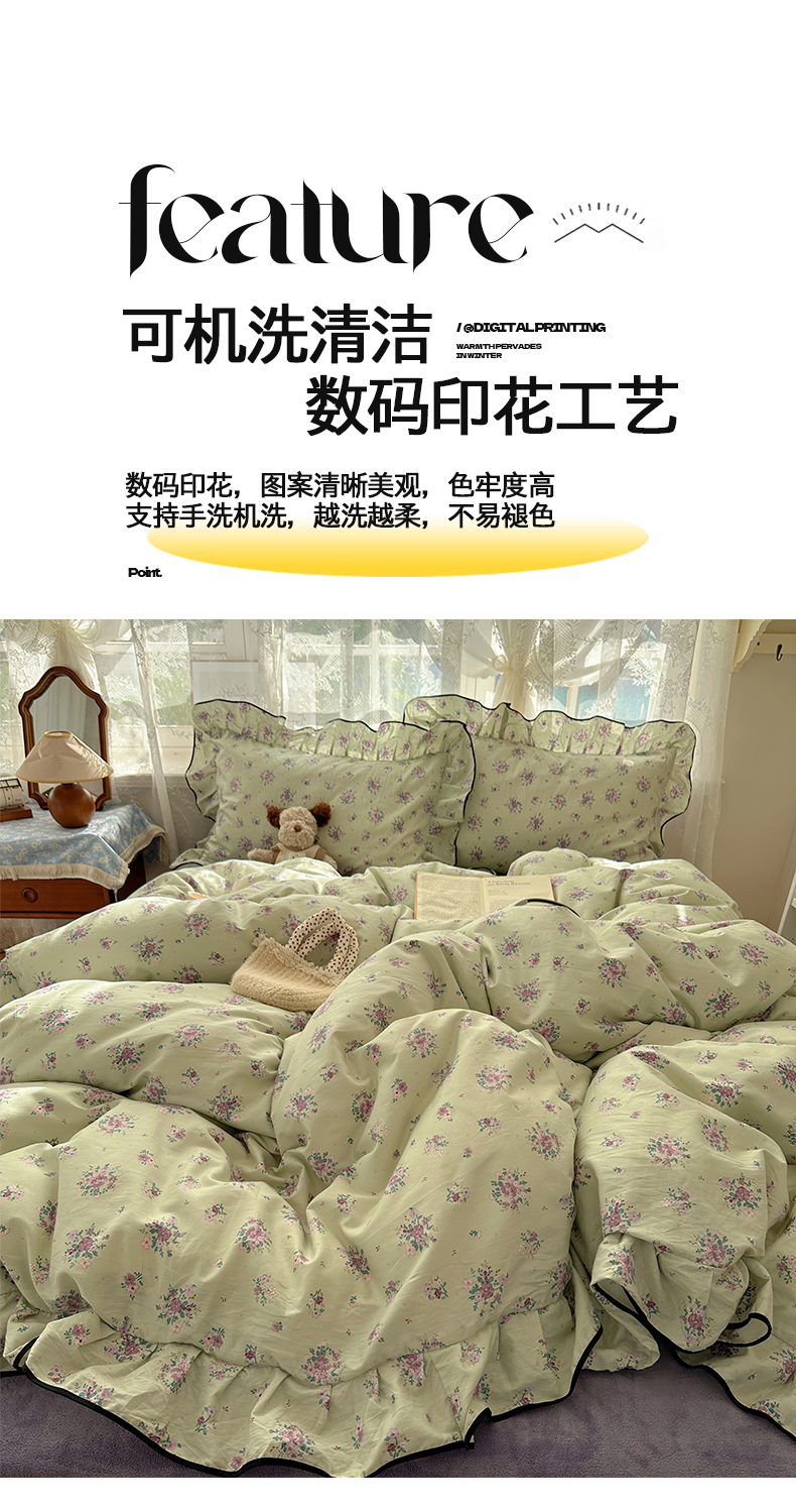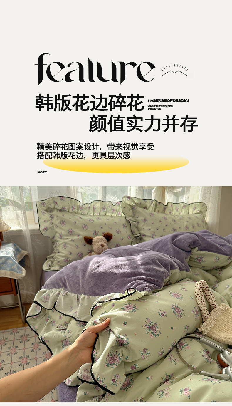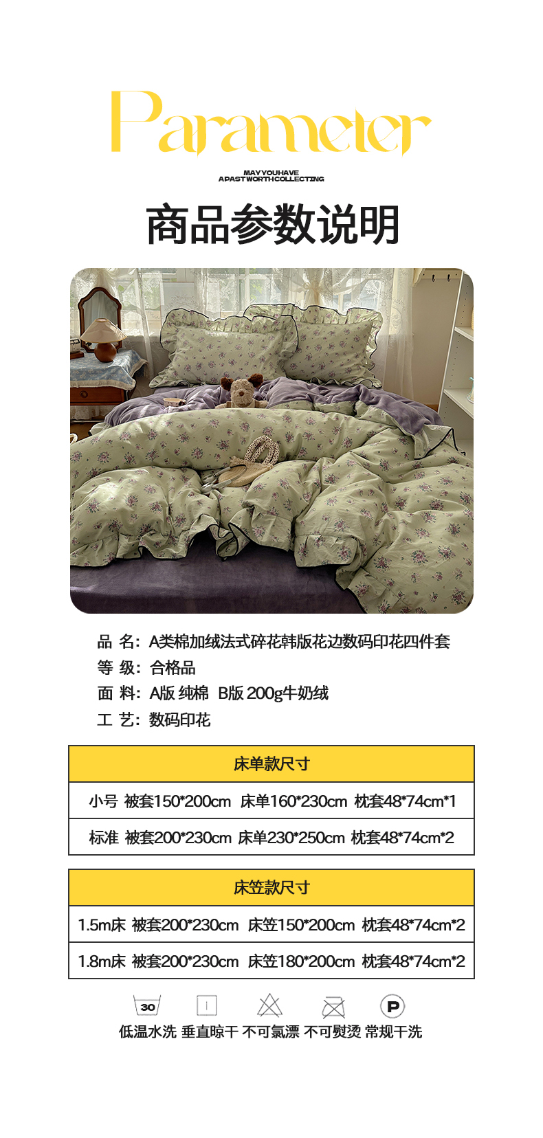 商品名称:桃子家居 2025新款A类纯棉数码印花法式碎花棉加绒韩版花边碎花加厚牛奶绒四件套 棉加绒-花边浮影