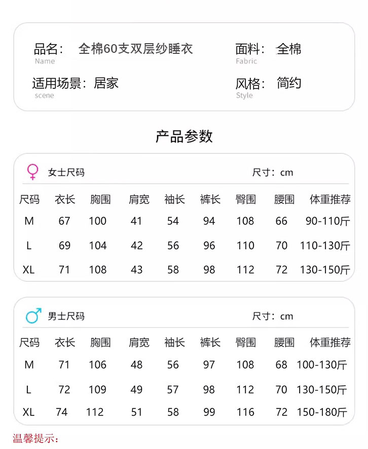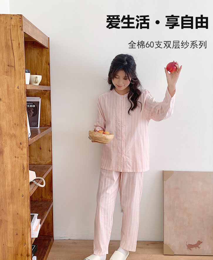 商品名称:观月轩家纺 2025新款全棉纯棉60支双层纱系列家居服 女款-粉白条