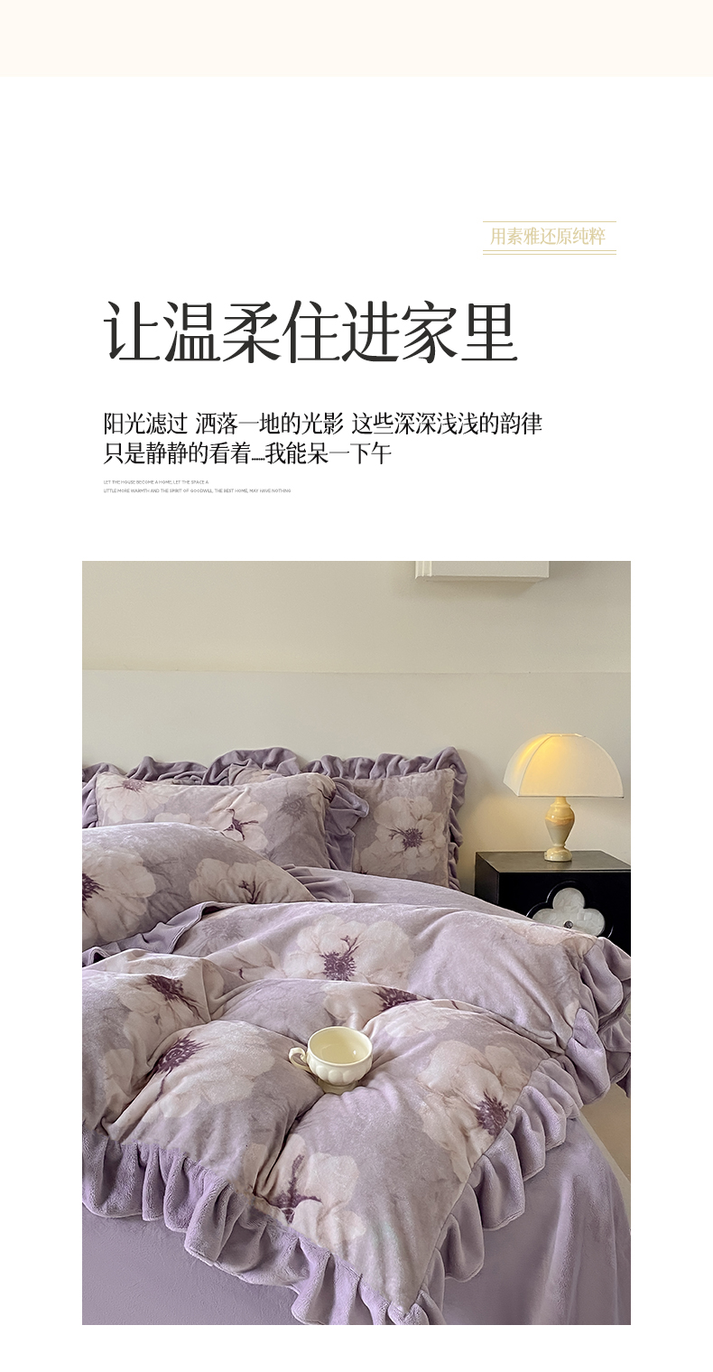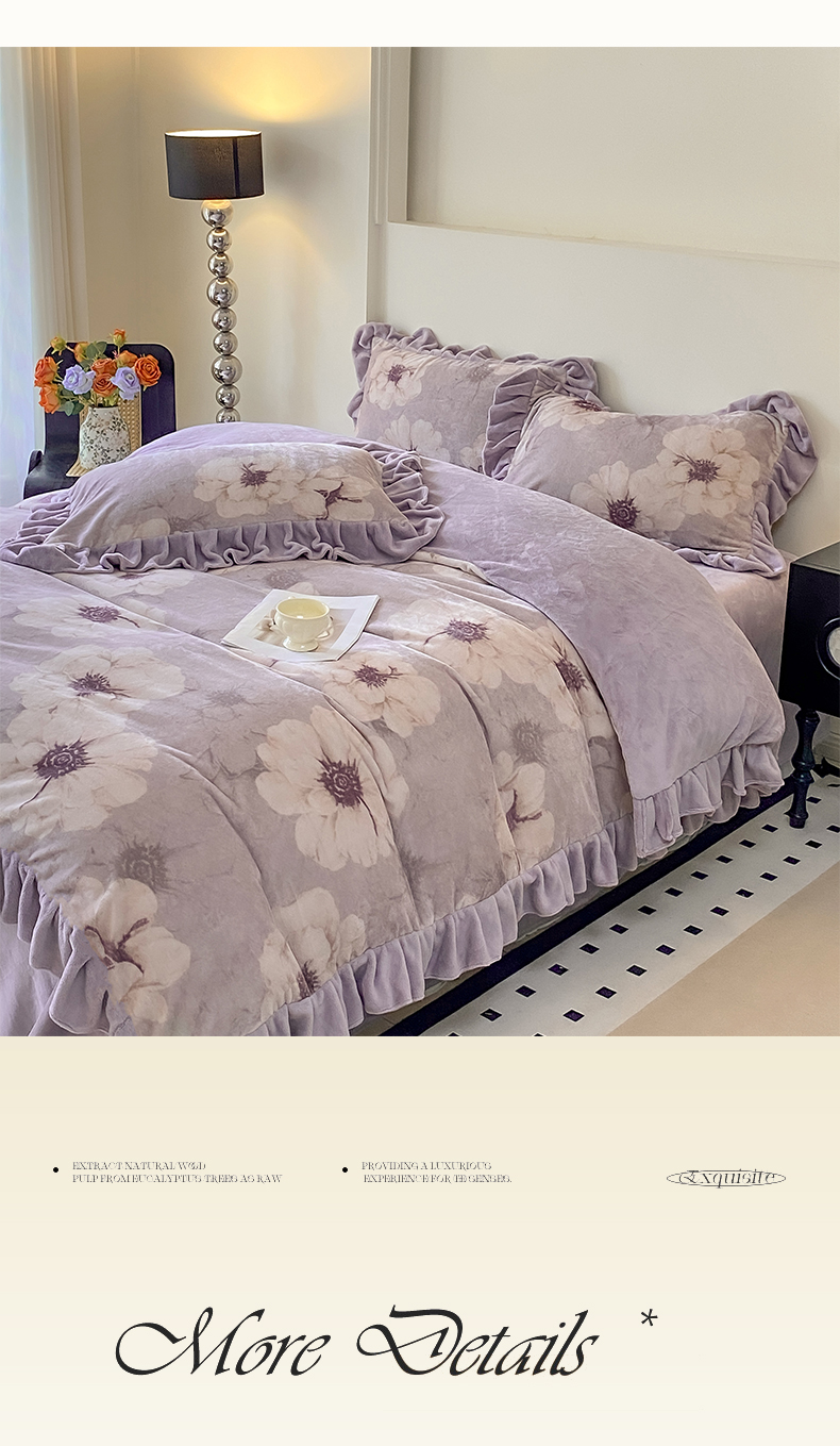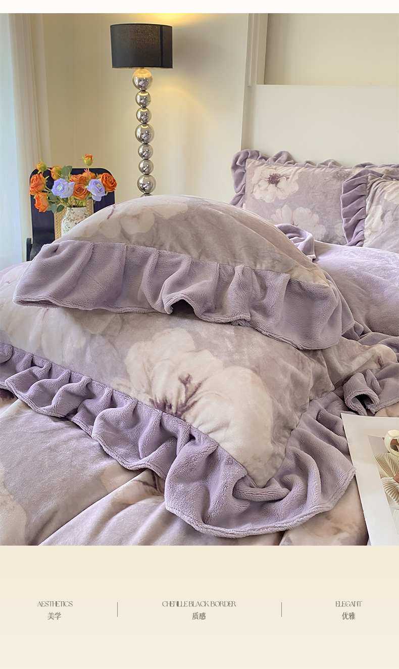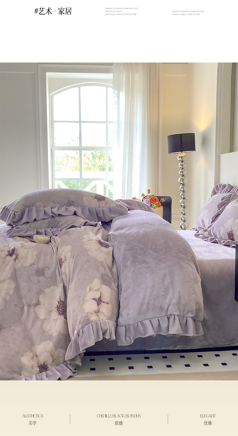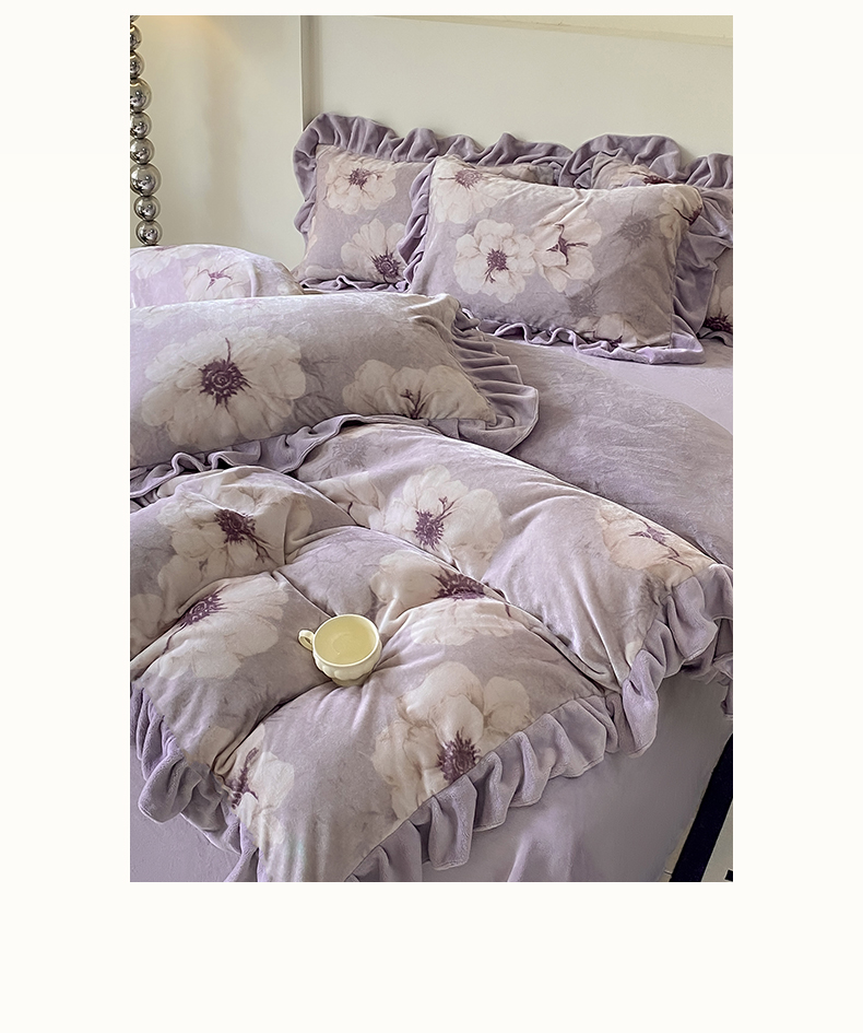 当前位置: 91家纺网 > 商品网购 > 床品套件 > 四件套 > 牛奶绒四件套 > 慕希家纺 2025新款高克重牛奶绒花边款四件套 虞美人-紫