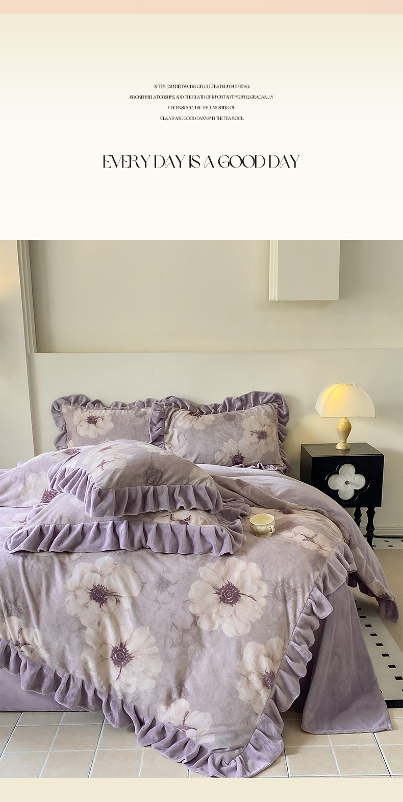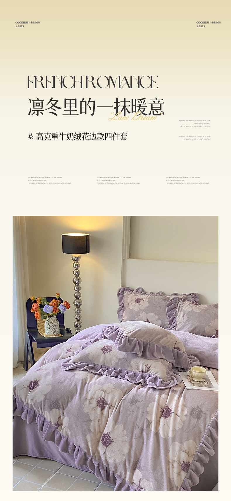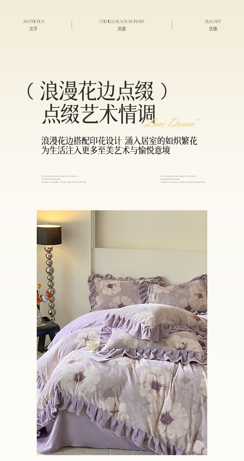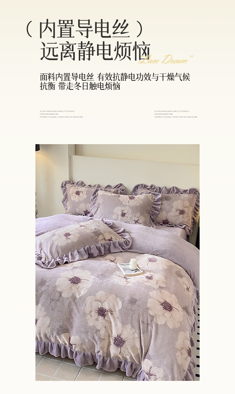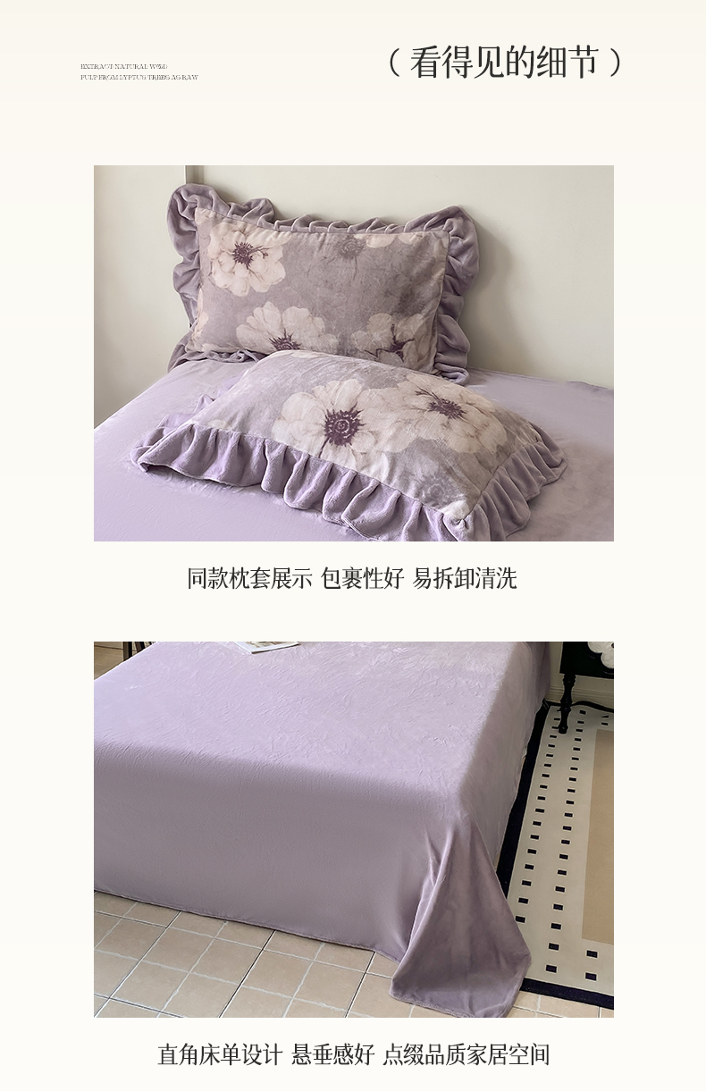 当前位置: 91家纺网 > 商品网购 > 床品套件 > 四件套 > 牛奶绒四件套 > 慕希家纺 2025新款高克重牛奶绒花边款四件套 虞美人-紫
